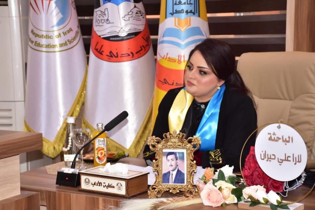 حضر جانبا منها الاستاذ الدكتور قصي كمال الدين الاحمدي رئيس جامعة الموصل مناقشة رسالة الماجستير الموسومة ب (التشكيل الفني للصورة في شعر محمد جلال الصائغ) ، يوم الاثنين 16 كانون الثاني 2023 ، كما حضرها عميد الكلية الاستاذ الدكتور محمد علي محمد عفين ومعاونيه للشؤون العلمية والادارية ورئيس قسم اللغة العربية وعدد من تدريسيي وطلبة الكلية .تناولت الدراسة التي تقدمت بها الطالبة لارا علي اهمية الصورة في شعر محمد جلال الصائغ كون الشاعر من الشعراء الموصليين .هدفت الدراسة الى دراسةالتشكيل الفني للصورة من خلال عرض اهم التقسيمات التي تضمنتها الصورة قسمت الرسالة الى فصلين ومباحث متنوعة تضمن الفصل الاول المرجعيات الدلالية مع تقسيم الدلالية الى عدة مباحث
