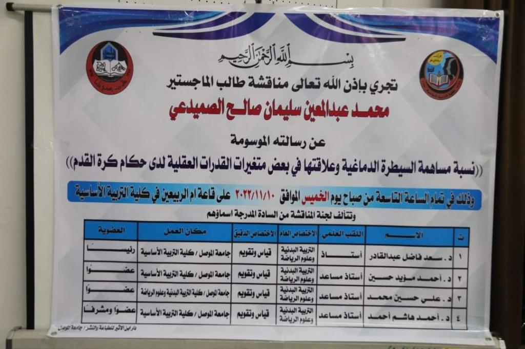 ناقش قسم التربية البدنية وعلوم الرياضة في كلية التربية الأساسية رسالة الماجستير الموسومة (نسبة مساهمة السيطرة الدماغية وعلاقتها في بعض متغيرات القدرات العقلية لدى حكام كرة القدم) يوم الخميس ١٠ تشرين الثاني ٢٠٢٢، في قاعة ام الربيعين ،حضر جانباً منها السيد رئيس الجامعة الأستاذ الدكتور قصي كمال الدين الاحمدي والسيد عميد الكلية الأستاذ المساعد الدكتور صفاء الدين عبد الله سليمان .تناولت الرسالة التي تقدم بها الطالب (محمد عبد المعين سليمان) موضوع السيطرة الدماغية cerebra dominance أو السيطرة المخية brain dominance أو النصف الكروي القائد leading hemisphereأو الجانب القائد في الدماغ من الموضوعات الحديثة والمثيرة والمفيدة التي نالت اهتمام علماء النفس العصبي في بداية الأمر، ثم تناولها بالاهتمام والدراسة والتطبيق علماء التربية والمناهج وطرائق التدريس وعلم النفس المعرفي وعلم النفس التربوي وعلم النفس الرياضي في الفترة الحالية.يهدف البحث الى اعداد القدرات العقلية التي يتميز بها الأنسأن من بين أهم العوامل والمحددات في عمل وتعلم وتدريب المهارات الخططية والتي اهتم بها العاملون في المجال الرياضي لغرض دراسة ومعرفة الفروق الفردية بين الاشخاص.ترأس لجنة المناقشة الاستاذ الدكتور سعد فاضل عبد القادر ، وعضوية كلا من الاستاذ المساعد الدكتور احمد مؤيد حسين، الاستاذ المساعد الدكتور علي حسين محمد، وبإشراف وعضوية ، الاستاذ المساعد الدكتور احمد هشام احمد.