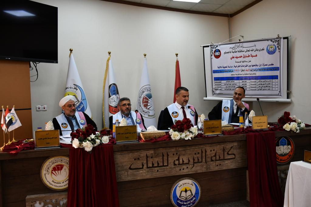 ناقشت كلية التربية للبنات في جامعة الموصل رسالة الماجستير الموسومة ” كسر همزة (إن) وفتحها في القراءات القرآنية – دراسة نحوية دلالية ” يوم 2 تشرين الثاني 2022.تناولت الدراسة التي تقدمت بها الطالبة هبة طارق حميد علي في قسم اللغة العربية الأحرف المشبهة بالفعل التي اعتمدها علماء النحو في مصنفاتهم قديماً وحديثاً وكذلك في القراءات القرآنية بالدراسة والتحليل والتفسير .تطرقت الدراسة الى جواز كسر همزة (إن ) وفتحها بعد أفعال القلوب وإن لم يكن في خبرها اللام التي جاءت في القراءات القرانية.ترأس لجنة المناقشة الاستاذ الدكتور فراس عبدالعزيز عبدالقادر وعضوية كلاً من الاستاذ الدكتور محمد ذنون يونس والاستاذ الدكتور عبدالكريم علي عمر وبإشراف وعضوية محمد اسماعيل محمد..