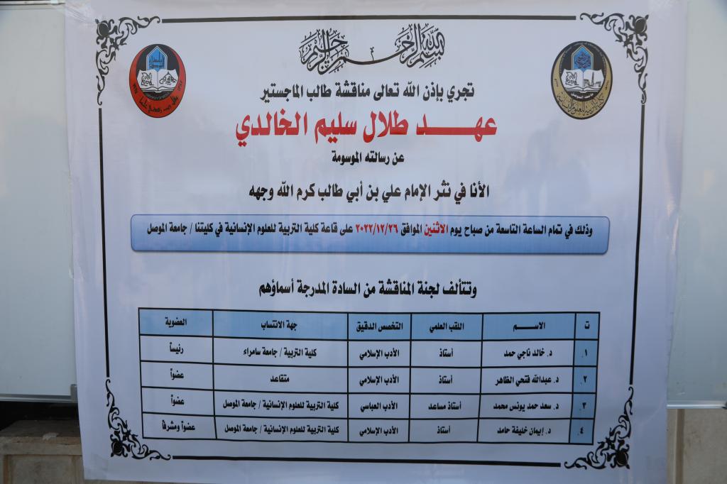 ناقش قسم اللغة العربية في كلية التربية للعلوم الإنسانية بجامعة الموصل رسالة الماجستير الموسومة بـ(الأنا في نثر الإمام علي بن أبي طالب كرّم الله وجهه) يوم الاثنين ٢٦ كانون الاول ٢٠٢٢، حضر جانباً منها السيد نجم الجبوري محافظ نينوى والاستاذ الدكتور قصي كمال الدين الاحمدي رئيس جامعة الموصل وشخصيات من المدينة فضلا عن الأستاذ الدكتور حازم ذنون إسماعيل السبعاوي عميد الكلية وعدد كبير من أساتذة قسم اللغة العربية في الكلية .تناولت الرسالة التي تقدّم بها الطالب (عهد طلال سليم الخالدي) الى قسم اللغة العربية حضور الانا في النصوص النثرية التي قالها الامام علي بن ابي طالب كرم الله وجهه ، وقد تطرقت الدراسة إلى حركة الانا في النص النثري الإسلامي ومدى فاعليتها في بناء هذا النص فضلا عن كونها وقفت عند المدلولات اللغوية للـ(أنا) والنفسية والفلسفية والدينية وقد جاءت في فصلين وتمهيد، تهدف الرسالة إلى بناء منظومة فكرية قادرة على إعادة قراءة النص الادبي عامة .ترأس لجنة المناقشة الأستاذ الدكتور خالد ناجي السامرائي ، وعضوية كلا من الأستاذ الدكتور عبد الله فتحي الظاهر، والأستاذ المساعد الدكتور سعد حمد الراشد وبإشراف وعضوية،