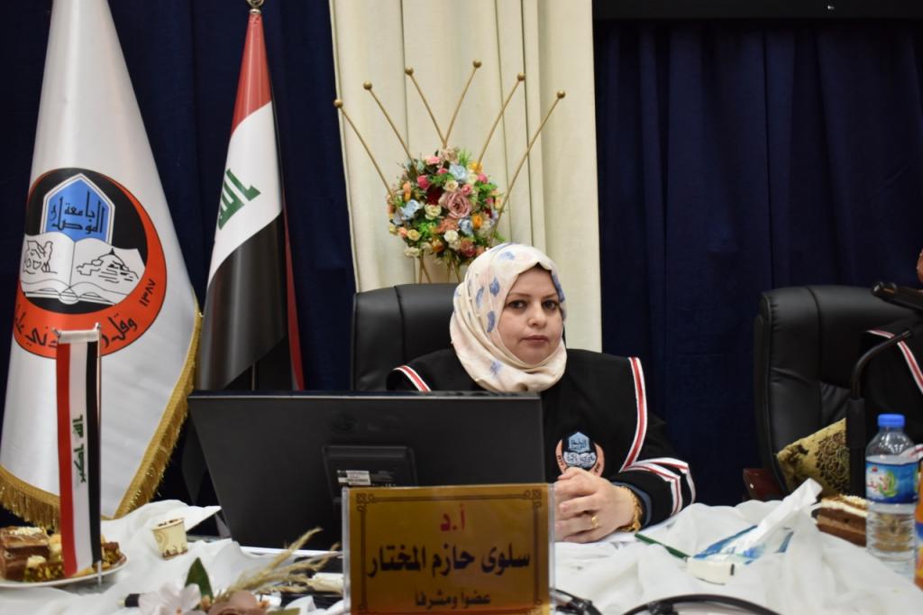ترأس لجنة المناقشة الاستاذ الدكتور اسامة اسماعيل خضر المشهداني وعضوية كلاً من الاستاذ المساعد الدكتور اسماعيل ابراهيم السنجري والدكتورة سجى عبد الباري الجوادي وبإشراف وعضوية الاستاذ الدكتور سلوى حازم المختار.