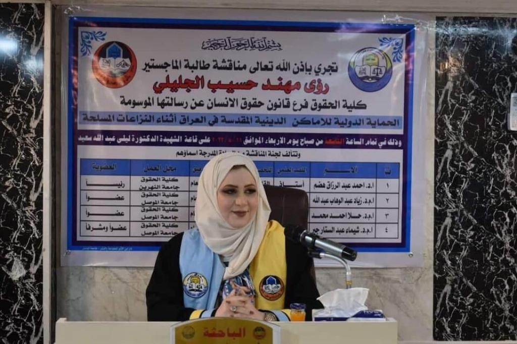 ناقشت كلية الحقوق بجامعة الموصل رسالة الماجستير عن الحماية الدولية للاماكن الدينية المقدسة في العراق اثناء النزاعات المسلحة ، يوم الاربعاء ١١ أيار ٢٠٢٢ ،حضر جانبا منها عميد الكلية وعدد من اعضاء مجلس الكلية وتدريسييها .تناولت الدراسة التي تقدمت بها الطالبة رؤى مهند حسيب في فرع قانون حقوق الانسان الاماكن الدينية المقدسة ومكانتها لدى الشعوب لما تحتويه من مقتنيات روحية وعقائدية وما تحمله من اهمية اقتصادية وسياسية وحضارية .تطرقت الدراسة الى اهتمام المجتمع الدولي بحماية هذه الاماكن المقدسة خلال فترة النزاعات المسلحة سواء كانت ذات طابع دولي او غير ذي طابع دولي حيث اوجبت على اطراف النزاع الالتزام بقواعد حماية الاماكن الدينية المقدسة .تهدف الدراسة الى بيان اتفاقية لاهاي لعام ١٩٥٤ اضفت حماية للاماكن الدينية المقدسة بإعتبارها من ضمن الممتلكات الثقافة حيث تنوعت هذه الحماية ما بين العامة والخاصة اضافة الى الحماية المعززة التي جاء بها البروتوكول الاضافي الثاني لعام ١٩٩٩ لاتفاقية لاهاي إلا ان هذه الحماية كانت قاصرة وغير كافية نظرا للانتهاكات الجسيمة التي تعرضت لها الاماكن الدينية المقدسة .ترأس لجنة المناقشة الاستاذ الدكتور احمد عبدالرزاق هضم وعضوية كلاً من الاستاذ المساعد الدكتور زياد عبدالوهاب عبدالله والاستاذ المساعد الدكتورة حلا احمد محمد وباشراف وعضوية الاستاذ المساعد الدكتورة شيماء عبدالستار جبر .