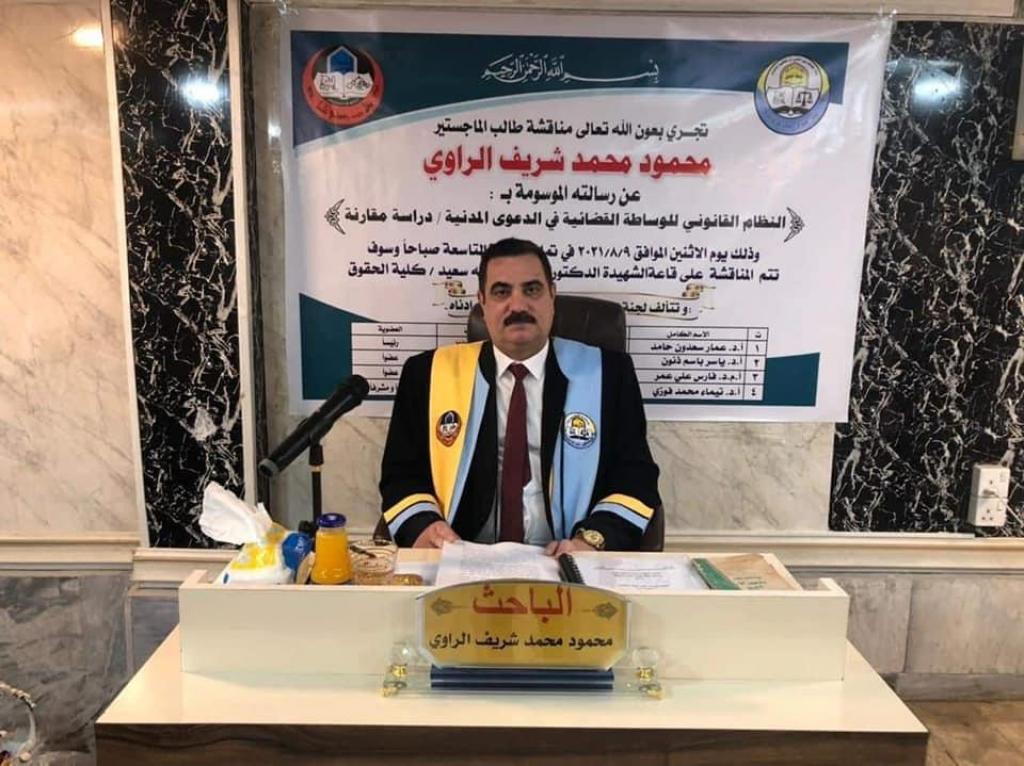ناقشت كلية الحقوق بجامعة الموصل رسالة ماجستير عن النظام القانوني للوساطة القضائية في الدعوى المدنية/دراسة مقارنة يوم الثلاثاء ١٠ آب ٢٠٢١ ، حضر جانباً منها عميد الكلية وعدد من اعضاء مجلس الكلية وتدريسييها .تناولت الدراسة التي تقدم بها الطالب محمود محمد شريف في فرع القانون الخاص البحث عن وسائل بديلة في فض النزاعات بطرائق ودية فعلى الرغم من ان حق التقاضي امام المحاكم يتمتع بضمانات معينة منها ما يتعلق بصحة القضاء والاطمئنان الى حسن سير العدالة وحياد القاضي وغيرها .