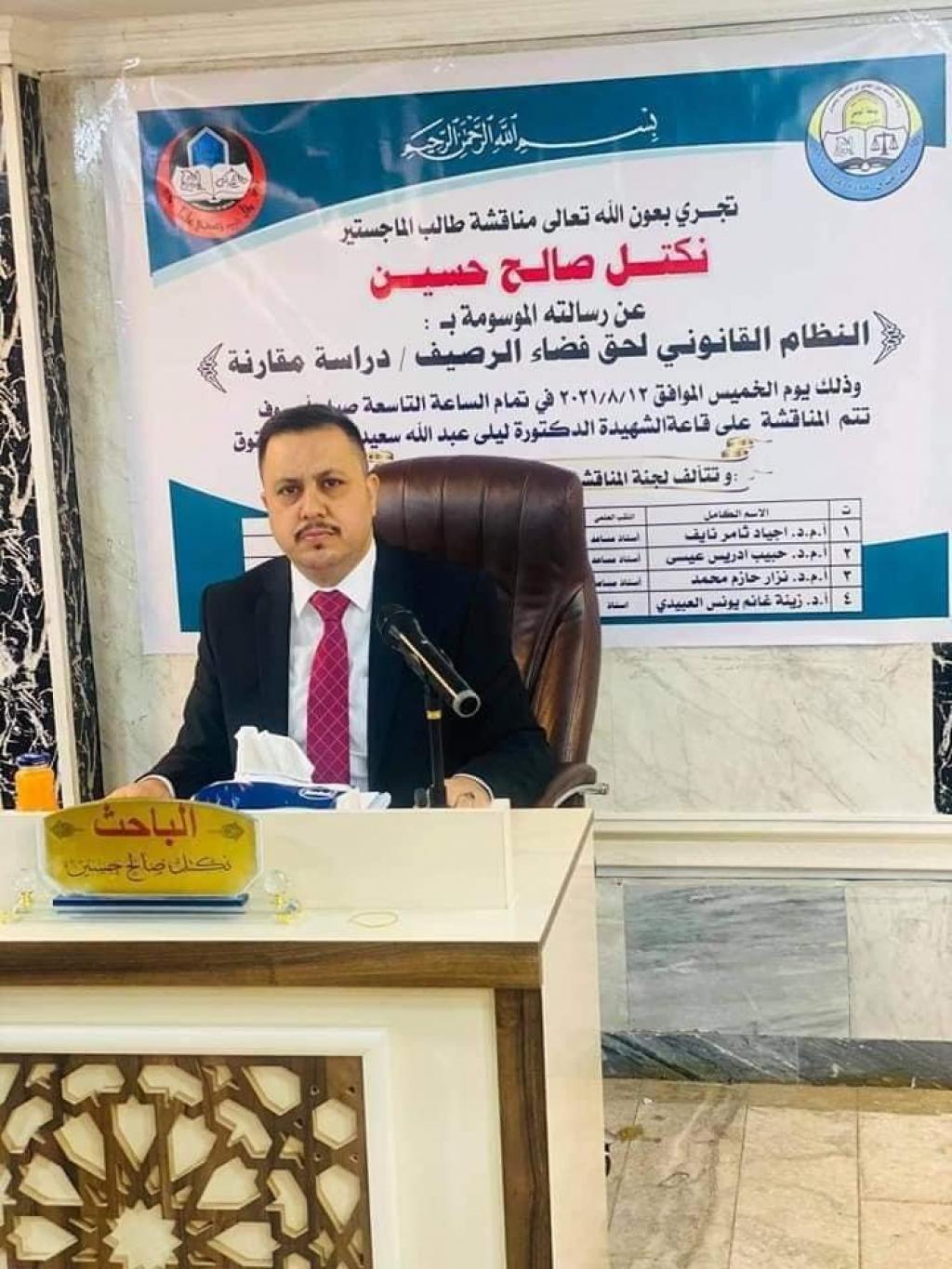 ناقشت كلية الحقوق بجامعة الموصل يوم الخميس 12 آب 2021 رسالة ماجستير عن النظام القانوني لحق فضاء الرصيف ، و حضر جانبا منها عميد الكلية وعدد من اعضاء مجلس الكلية وتدريسييها .