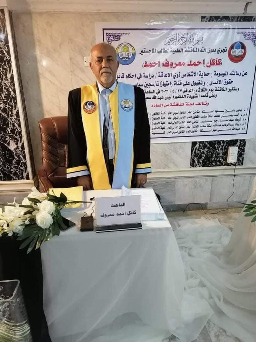 ناقشت كلية الحقوق بجامعة الموصل رسالة ماجستير عن حقوق الانسان في حماية الاشخاص ذوي الاعاقة-دراسة في احكام قانون حقوق الانسان يوم الثلاثاء الموافق 27 نيسان 2021تناولت الرسالة التي تقدم بها الطالب كاكل احمد معروف الاعاقة التي تشكل ظاهرة تعاني منها المجتمعات دون استثناء اذ لا يخلو منها مجتمع مهما بلغت درجة تقدمه حيث ازداد ذوو الاعاقة خاصة في السنوات القليلة الماضية بفعل الإرهاب والحروب الاهلية والثورات الداخلية وارتفاع حوادث النقل وقلة الرعاية الصحية وزواج الاقارب وزيادة الشيخوخة بين الناس وغيرها بالتالي فالاشخاص ذوو الاعاقة يعانون من تمييز تقيد مشاركتهم في المجتمع على قدم المساواة مع غيرهم اذ كانوا مهمشين اذ ان الاشخاص ذوو الاعاقة ظلوا بعيدا عن موضوع الحماية الدولية لغياب صك دولي يبين مركزهم القانوني .تهدف الدراسة الى وضع تعريف لذوي الاعاقة فهم اشخاص يعانون من نقص دائم في القدرات والمؤهلات البدنية اوالعقلية او الذهنية او الحسية سواء ولدوا به او الحقوا بهم بعد الولادة مما يحد من فرص ادماجهم ومشاركتهم بصورة كاملة وفعالة في المجتمع .ترأس لجنة المناقشة الاستاذ الدكتور يحيى ياسين سعود وعضوية الاستاذ المساعد الدكتور خلف رمضان محمد والمدرس الدكتور ة شيماء عبدالستار جبر وعضوية واشراف الاستاذ المساعد الدكتور زياد عبدالوهاب عبدالله .