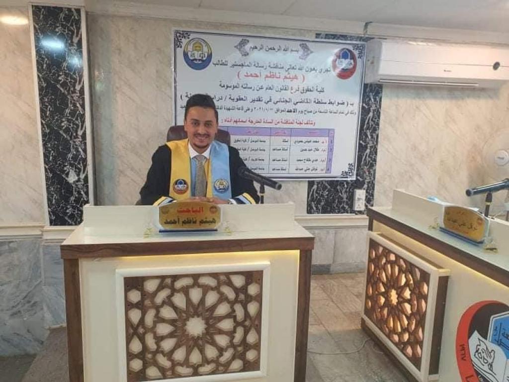 ناقشت كلية الحقوق بجامعة الموصل رسالة ماجستير عن ضوابط سلطة القاضي الجنائي في تقدير العقوبة/دراسة مقارنة يوم الاحد 22 آب 2021 ، حضر جانبا منها عميد الكلية وعدد من اعضاء مجلس الكلية وتدريسييها .تناولت الرسالة التي تقدم بها الطالب هيثم ناظم احمد في فرع القانون العام تحديد العقوبة الملائمة لخطورة الجريمة وظروف مرتكبها والتي تعد من اهم جوانب السلطة التقديرية التي يمنحها المشرع للقاضي الجنائي كي يتحقق الغرض من العقاب بما يقيم العدالة في نهاية الامر .تهدف الدراسة الى وضع تعريف للقاضي الجنائي بأنه مقدرة القاضي الجنائي على اختيار العقوبة الانسب وفقا لحديها الادنى والاعلى بالنص القانوني بحسب ظروف الجاني الشخصية وظروف ارتكاب الجريمة .توصلت الدراسة الى مسوغات منح السلطة التقديرية للقاضي ومراحل تطورها .ترأس لجنة المناقشة الاستاذ الدكتور محمد عباس حمودي وعضوية كلاً من الدكتور طلال عبد حسين والدكتور عدي طلفاح محمد وعضوية واشراف الدكتور نوفل علي عبدالله .