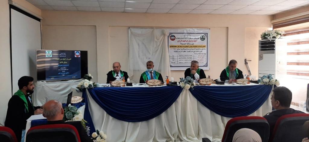 ترأس لجنة المناقشة الاستاذ الدكتور علي كريم الطائي وعضوية كل من الأستاذ المساعد الدكتور خالد محمود احمد والاستاذ المساعد الدكتور بسام يحيى ابراهيم وبإشراف وعضوية الاستاذ الدكتور نبيل عزيز قاسم.
