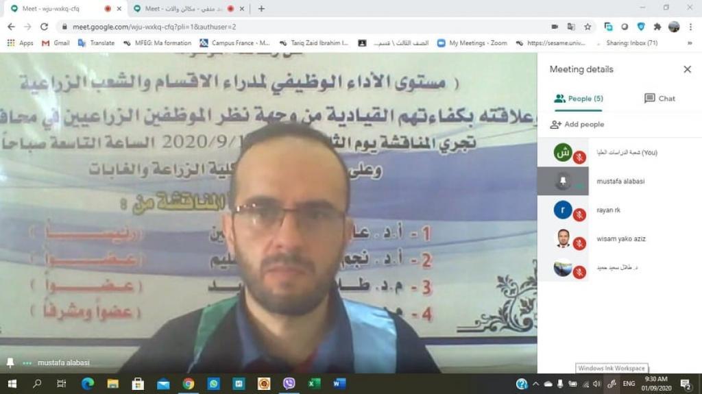ناقشت كلية الزراعة والغابات في جامعة الموصل رسالة ماجستير في قسم الارشاد الزراعي ونقل التقنات بعنوان (مستوى الاداء الوظيفي لمدراء الاقسام والشعب الزراعية وعلاقته بكفاءاتهم القيادية من جهة نظر الموظفين الزراعيين في محافظة نينوى )،عبر الفضاء الالكتروني، يوم الثلاثاء الموافق 1ايلول 2020 ، بحضور عميد الكلية الدكتور محمد يونس العلاف .