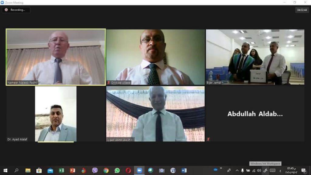 ترأس لجنة لجنة المناقشة الاستاذ الدكتور تمير نجيب فاضل وعضوية كلاً من ( أ.م.د. ازاد احمد طيب ، أ.م.د. أياد هاني العلاف، أ.د. جاسم محمد علوان / عضواً ومشرفاً ) .