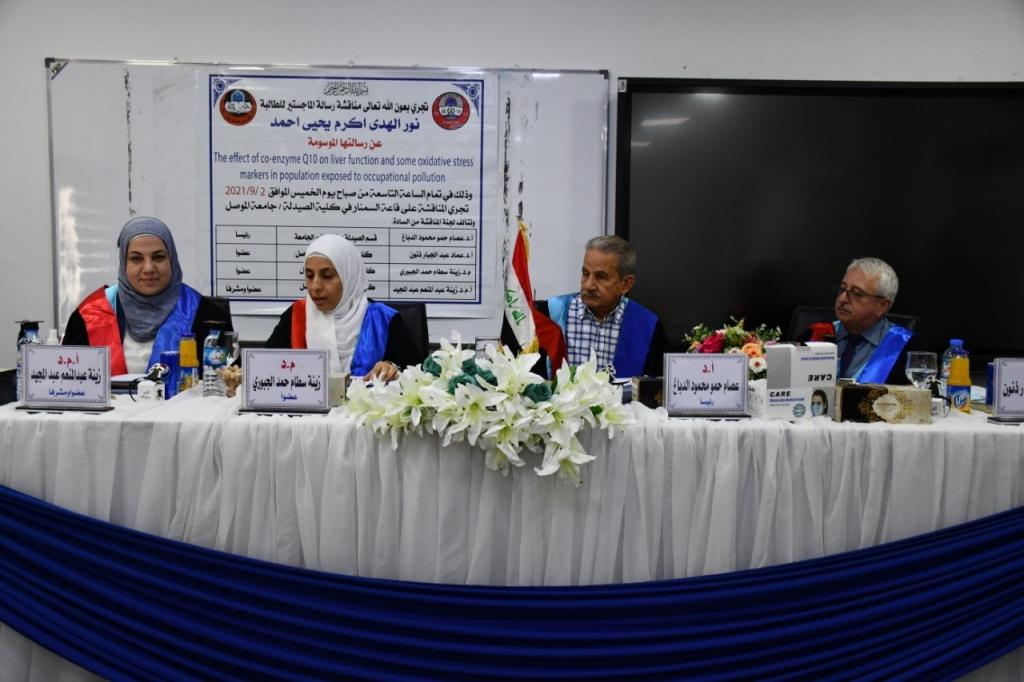 ناقشت كلية الصيدلة في جامعة الموصل رسالة ماجستير عن تأثيرات مساعدات الانزيم Q10 على وظائف الكبد، حضر جانباً منها السيد رئيس الجامعة الاستاذ الدكتور قصي كمال الدين الاحمدي.