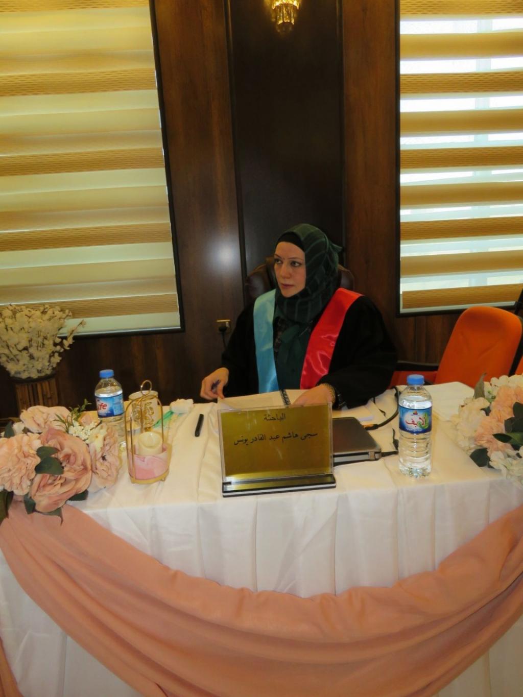 ترأس لجنة المناقشة الاستاذ المساعد الدكتور جلال علي جلال وعضوية كل من الاستاذ المساعد الدكتور اخلاص احمد علي والمدرس الدكتور مصطفى صلاح فضيل وبإشراف وعضوية الاستاذ الدكتور وحدة محمد طيب النعيمي.