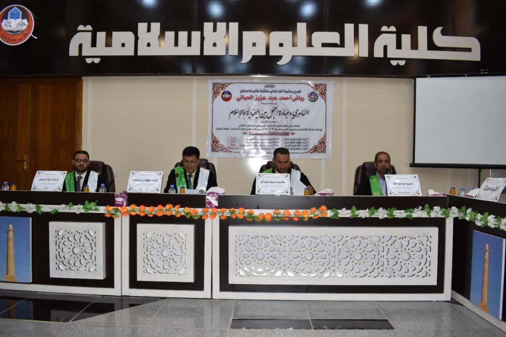 جرت في كلية العلوم الاسلامية بجامعة الموصل مناقشة رسالة الماجستير للطالب رياض أحمد عبد عزيز الحيالي الموسومة بـعنوان (السامري وعبادة العجل بين اليهودية والإسلام – دراسة مقارنة) في قسم العقيدة والفكر الاسلامي صباح اليوم الخميس الموافق 24/6/2021. بحثت الرسالة مفردة من مفردات علم مقارنة الأديان ، وهي تلك الفتنة التي أحدثها السامري في بني اسرائيل عند غياب نبي الله موسى (عليه السلام) عنهم ، فعبدوا العجل ظنا منهم انه اله موسى (عليه السلام) . كما تناولت الرسالة المراحل التي عاشها بنو اسرائيل منذ دخولهم مصر وبعثة موسى (عليه السلام) وخروجهم منها، ودفاع القرآن الكريم عن نبي الله هارون وبراءته من صنع العجل، ثم الشبهات التي اثارها المستشرقون حول الموضوع وذلك بتفنيدها بالحجج البينات. توصلت الرسالة الى إن العقيدة اليهودية انحرفت انحرافا خطيرا في تصور الإله، أدى بها إلى التشبيه والتجسيم، فصورت الإله في صورة عجل تأثرا بالشعوب الوثنية التي خالطوها مدة إقامتهم معهم . وان القرآن الكريم نفى تهمة التوراة المحرفة وبرَّأ نبي الله هارون (عليه السلام) مما نسب إليه، ناسباً العمل للسامري الضال المضل.ترأس لجنة المناقشة الأستاذ المساعد الدكتور ثابت مهدي حمادي وعضوية كل من الأستاذ المساعد الدكتور خالد عبيد صالح (جامعة تكريت/كلية التربية للعلوم الانسانية) والأستاذ المساعد الدكتور غزوان صالح حسن والأستاذ المساعد الدكتور محمد يونس فلح عضواً ومشرفاً.