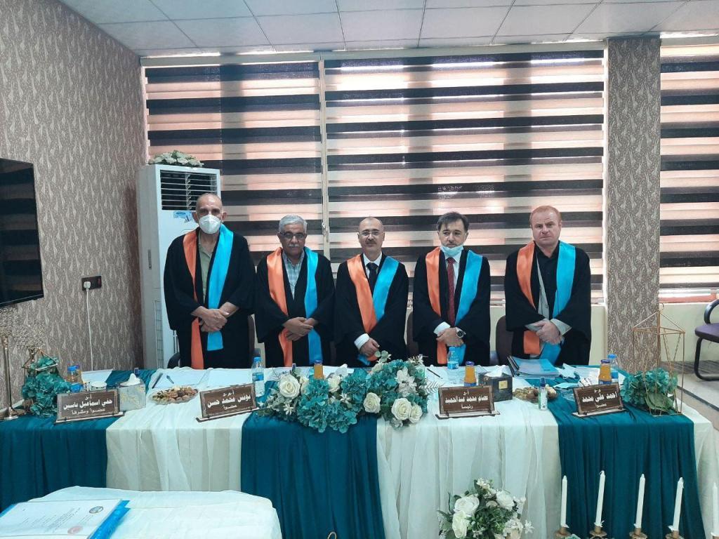 ترأس لجنة المناقشة الاستاذ الدكتور عصام محمد عبد الحميد وعضوية كل من الاستاذ المساعد الدكتور يونس محمد حسن والمدرس الدكتور احمد علي محمد العكيدي وأشراف وعضوية الاستاذ الدكتور حقي إسماعيل ياسين .