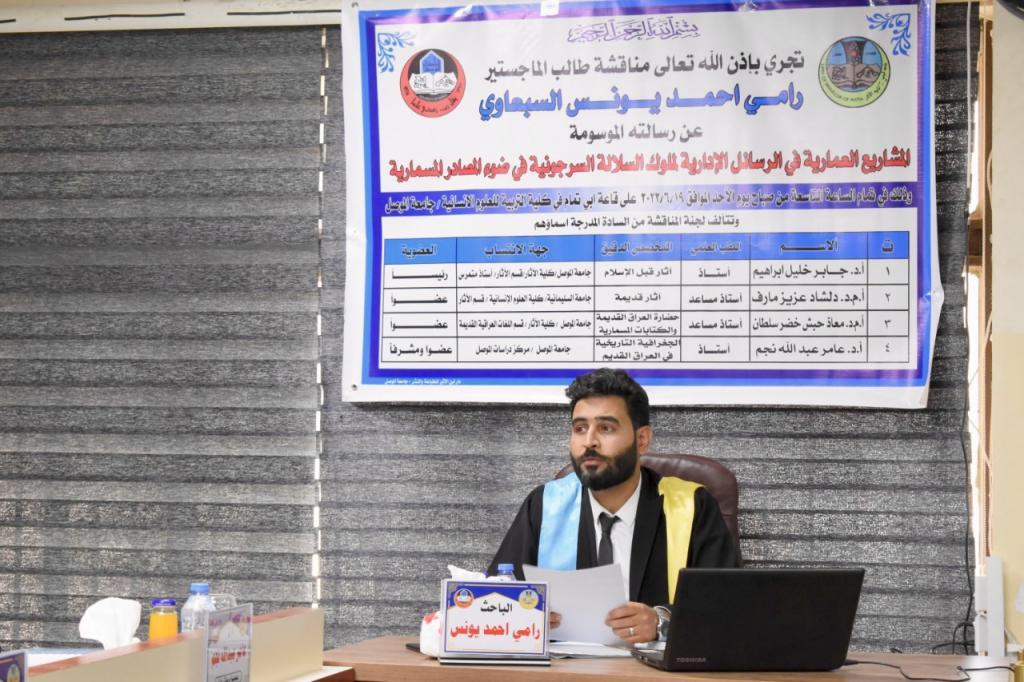ناقشت كلية الآثار بجامعة الموصل رسالة الماجستير الموسومة (المشاريع العمارية في الرسائل الإدارية لملوك السلالة السرجونية في ضوء المصادرالمسمارية)،يوم الاحد 19 حزيران 2022.تناولت الرسالة التي تقدم بها الطالب رامي احمد يونس السبعاوي من قسم الآثار موجز اً عن الحياة السياسية لبلاد آشور في عصر حكم السلالة السرجونية (721-612ق.م) وعن مواد البناء المستخدمة في تلك المشاريع .تطرقت الدراسة الى أصحاب المهن والحرف الذين اضطلعوا في تنفيذ تلك المشاريع وأبرز المعوقات التي كانت تواجه الجهاز الإداري الآشوري بشأن تسخير هؤلاء الأشخاص للعمل في المشاريع .تضمنت الدراسة طبيعة المشاريع العمارية ومن ضمن تلك المشاريع بناء الأسوار والقصور والمعابد والبيوت وغيرها.هدفت الدراسة الى تسليط الضوء على طبيعة المشاريع العمارية التي اضطلع بها ملوك السلالة السرجونية مما يدل على التطور الاقتصادي الذي شهدته المملكة الآشورية آنذاك وانعكس بطبيعة الحال على ما رُصِدَ وأَنفِقَ من تخصيصات من خزانة المملكة الآشورية على إقامة تلك المشاريع العمارية .ترأس لجنة المناقشة الاستاذ الدكتور جابر خليل ابراهيم وعضوية كلاً من الاستاذ المساعد الدكتور دلشاد عزيز مارف من جامعة السليمانية والاستاذ المساعد الدكتور