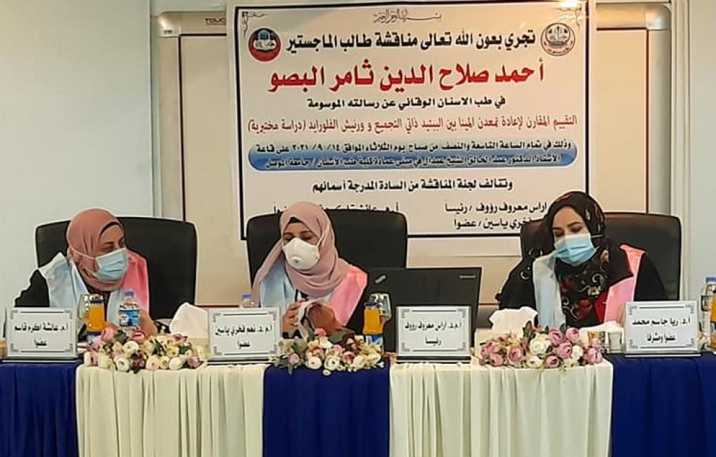 ناقشت كلية طب الأسنان في جامعة الموصل رسالة الماجستير الموسومة (التقييم المقارن لإعادة تمعدن المينا بين الببتيد ذاتي التجميع و ورنيش الفلورايد: دراسة مختبرية( ، يوم الثلاثاء 14 ايلول 2021، حضر جانبا منها الاستاذ المساعد الدكتور ريان سالم حامد عميد الكلية .