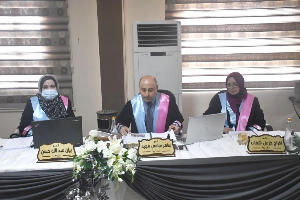ترأست لجنة المناقشة الاستاذ المساعد الدكتورة بيان عبدالله حسن من جامعة هولير الطبية وبعضوية كل من الاستاذ المساعد الدكتورة افراح خزعل شهاب والاستاذ المساعد الدكتور ساهر سامي مجيد وبأشراف وعضوية الاستاذ الدكتور ريا جاسم محمد .