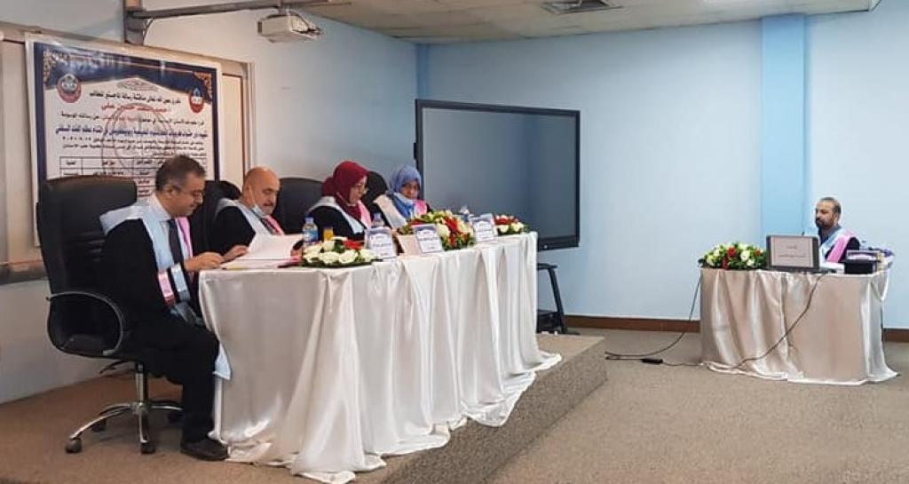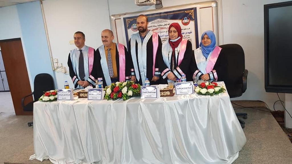 ترأس لجنة المناقشة الاستاذ الدكتور حسام الدين سالم محمد من كلية الطب /جامعة تكريت وبعضوية كل من الأستاذ المساعد الدكتور كرم هاشم يحيى والاستاذ المساعد الدكتورة مها طلال فتاح وبإشراف وعضوية الاستاذ الدكتورة غادة عبدالرحمن طاقة.