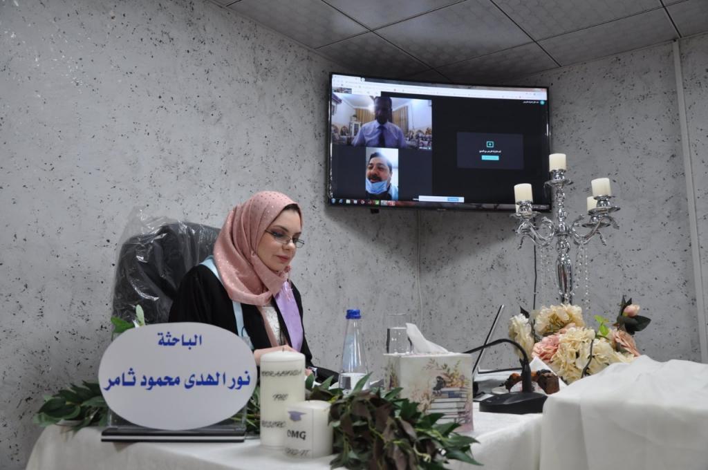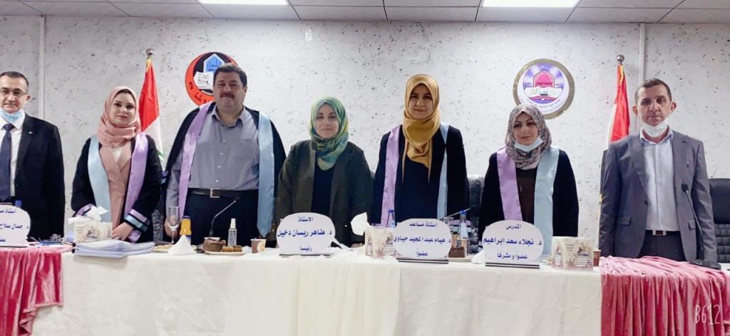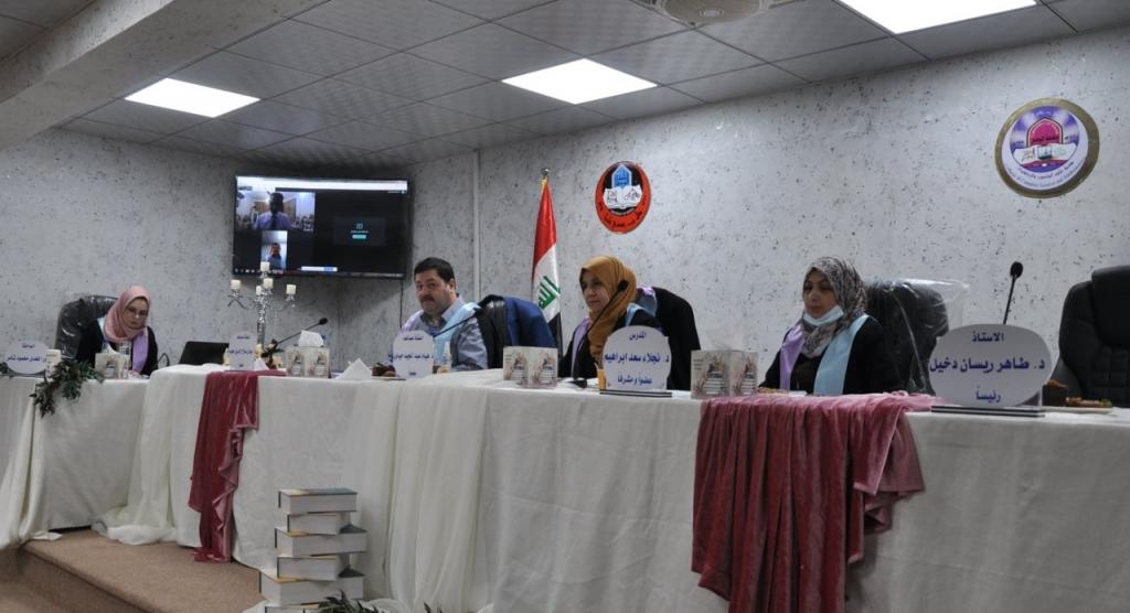 تراس لجنة المناقشة الاستاذ الدكتور طاهر ريسان دخيل وعضوية كل من الاستاذ المساعد الدكتور جمال صلاح الدين مجيد والاستاذ المساعد الدكتورة هيام عبد المجيد حياوي، وباشراف وعضوية المدرس الدكتورة نجلاء سعد ابراهيم.