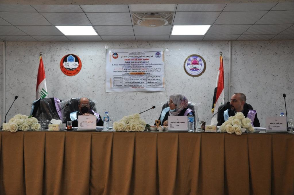 تراس لجنة المناقشة الاستاذ المساعد الدكتور فخر الدين حامد علي وعضوية كل من( ا.م.سندس خليل ابراهيم، ا.م.د. شيماء حميد شاكر) ،وباشراف وعضوية الدكتور زهير قيس الامين.