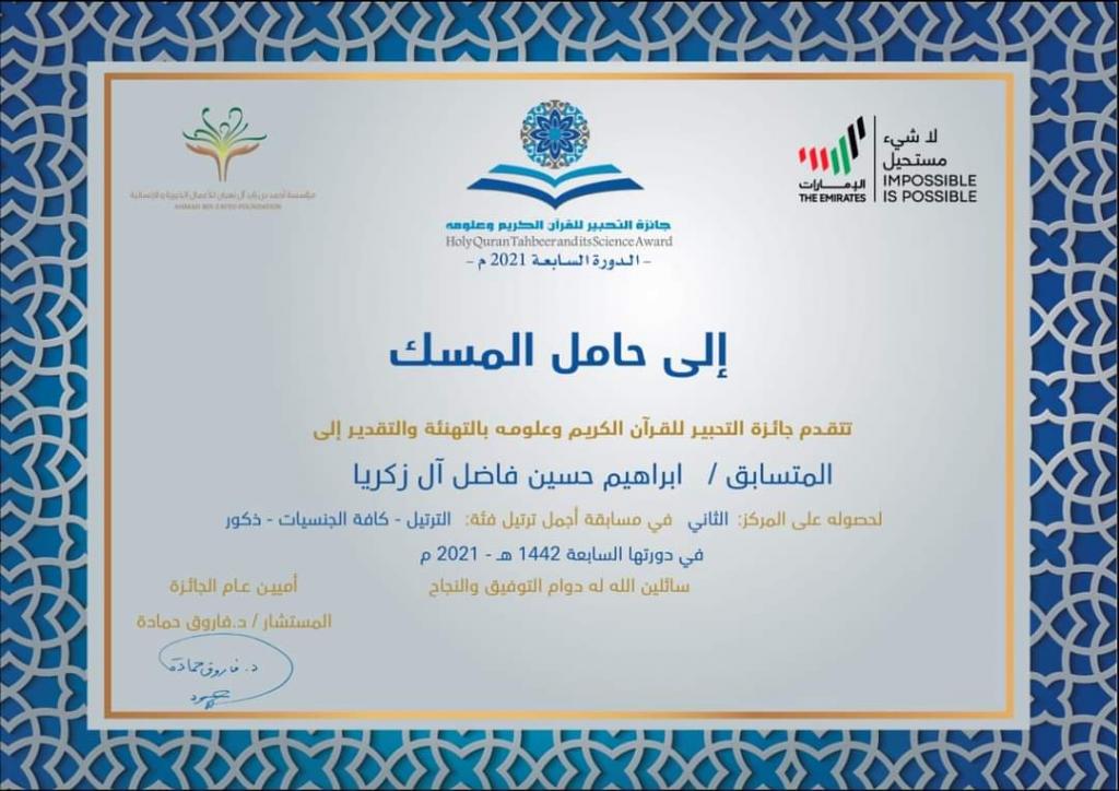حصل طالب الدراسات العليا ( ماجستير ) في كلية العلوم الاسلامية ( ابراهيم حسين فاضل آل زكريا) ، على المرتبة الثانية في تلاوة القرآن الكريم ( كافة الجنسيات – ذكور ) في مسابقة “التحبير للقرآن الكريم وعلومه 2021” في دورتها السابعة والتي اقامتها دولة الامارات العربية المتحدة للمدة من 1رمضان ولغاية 15 منه ، والتي شارك فيها 5407 متسابقاً من 81 جنسية من دول العالم المختلفة .