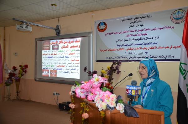 برعاية وحضور الأستاذ الدكتور أبي سعيد الديوه جي رئيس جامعة الموصل أقام فرع الاطفال والتقويم وطب الاسنان الوقائي ندوته العلمية السابعة بعنوان ” الجديد في طب اسنان الاطفال وطب الاسنان الوقائي : الافكار والتطبيقات السريرية ” وتحت شعار ” مواكبة الجديد = علاج طبي متميز ” بتاريخ 11 / 5 / 2014 بحثت في محاور وأهداف ركزت على العلاجات الحديثة في مجال طب اسنان الاطفال ومسببات تسوس الاسنان لدى الاطفال وطرق الوقاية الحديثة توزعت بحوثها على جلستين علميتين رأس الاولى منها الأستاذ حسين العبيدي ومقررية الأستاذ المساعد عائشة اكرم وكان فيها 3 محاضرات لكل من الأستاذ المساعد ريا جاسم والأستاذ المساعد كرم حازم والأستاذ المساعد بيداء علي فيما رأس الجلسة العلمية الثانية الأستاذ المساعد الدكتور علي راجح ومقررية الأستاذ المساعد غادة ضياء وكان فيها محاضرتان لكل من المدرس خولة محمد صالح والأستاذ المساعد عائشة اكرم فضلاً على محاضرة الافتتاح التي القتها الأستاذ المساعد غادة ضياء وفي ختام الندوة تليت أهم التوصيات التي خرجت بها الندوة .