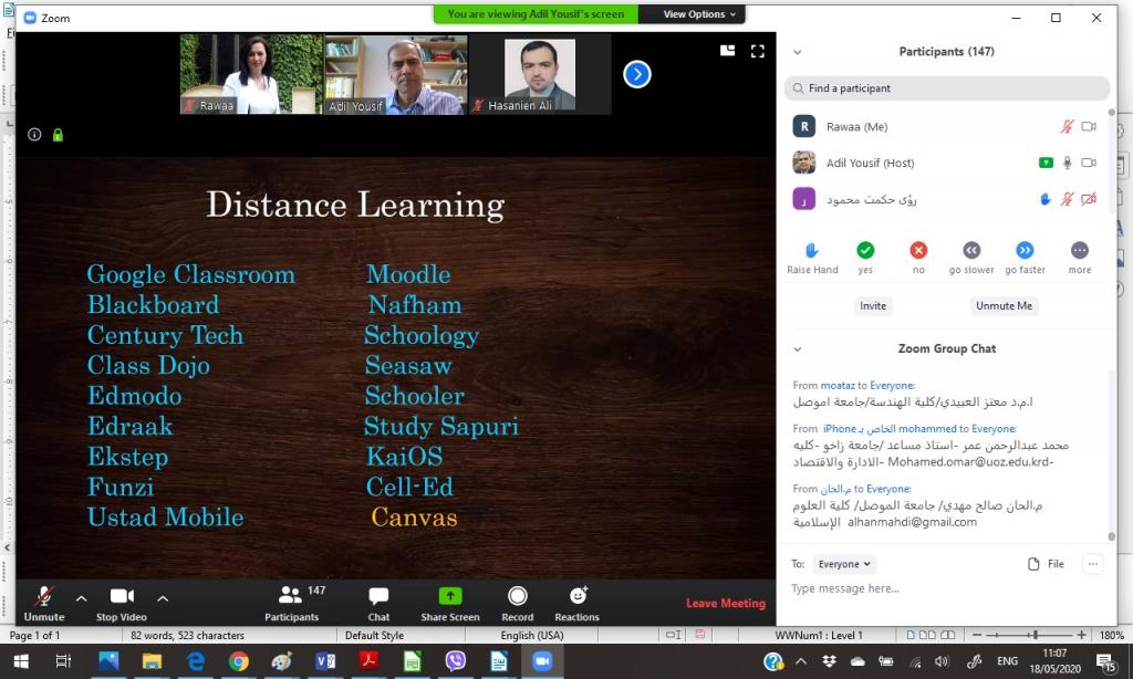 برعاية السيد رئيس جامعة الموصل الاستاذ الدكتور قصي كمال الدين الاحمدي المحترم وحضور السيد المساعد العلمي لرئيس الجامعة الاستاذ الدكتور منير سالم طه، بدأ قسم البعثات والعلاقات الثقافية في جامعة الموصل وبالتعاون مع معهد التعليم الدولي IIE-SRF ، بإقامة محاضرة دولية الكترونية عن آليات التعليم الالكتروني بحضور منسقة من المعهد الدولي ، شارك فيها تدريسين من جامعة الموصل ومن الجامعات والمؤسسات العراقية والعربية ، فضلا عن طلبة وموظفين من الجامعة . القى فيها الأستاذ الدكتور عادل يوسف /من قسم علم الاحياء والعلوم البيئية /جامعة غوتنبرغ /السويد محاضرة بعنوان (A gide to the distance learning platform Edmodo) عن آليات التعليم الالكتروني واهم المنصات التعليمية الالكترونية المعتمدة بالعالم ،وتضمنت شرحاً مفصلاً عن اساسيات التعامل مع منصة Edmodo ومدى فاعليتها وسهولة استخدامها من قبل التدريسين والطلاب.وتهدف الورشة الى التدريب على كيفية استعمال منصة Edmodo في التعلم الالكتروني وإنشاء الصفوف وإجراء الامتحانات الالكترونية ، والتعريف بمنصات التعليم الالكتروني المعتمدة عالمياً والياتها.