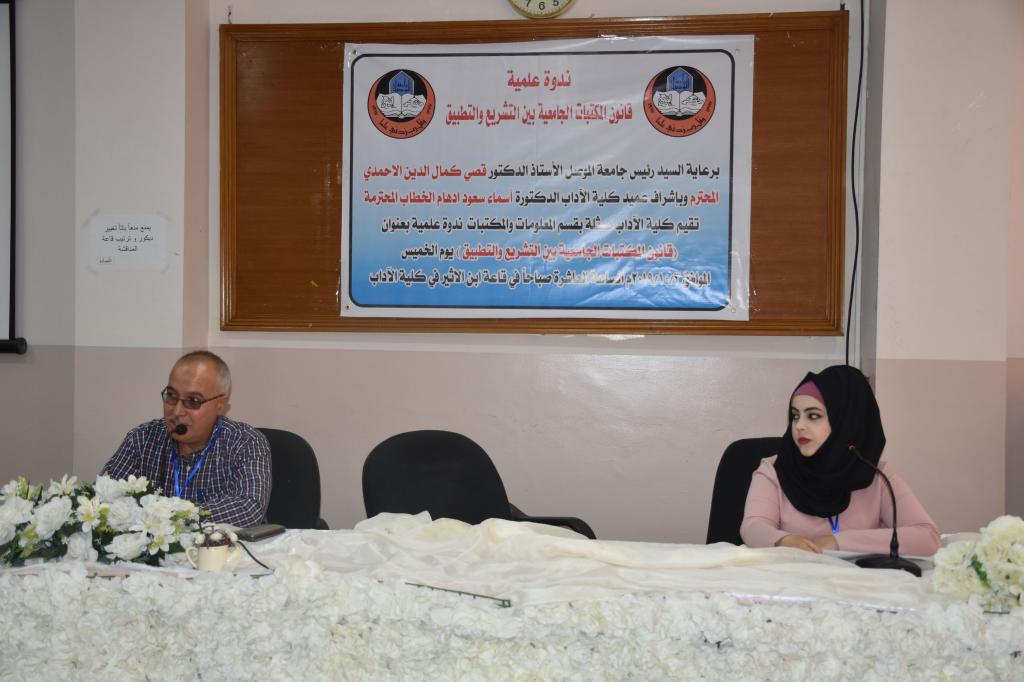 برعاية الاستاذ الدكتور قصي كمال الدين الاحمدي رئيس جامعة الموصل وحضور الاستاذ الدكتور اكرم محمود حسين مساعد رئيس الجامعة للشؤون الادارية ممثلاً عن سيادته . اقام قسم المعلومات والمكتبات في كلية الآداب ندوته العلمية بعنوان (المكتبات الجامعية بين التشريع والتطبيق) يوم الخميس الموافق 3 تشرين الاول 2019 وفي قاعة ابن الاثير في الكلية , حضرها الدكتورة اسماء سعود الخطاب عميد كلية الآداب وعدد من تدريسيي الكلية .. تضمنت كلمة رئاسة القسم للأستاذ الدكتور محمود صالح اسماعيل واستعراض قانون المكتبات الجامعية للأستاذ الدكتور عمار عبداللطيف زين العابدين كما اشتملت على مناقشات خصت التعليمات الخاصة بالمكتبات المركزية الجامعية والفرعية للكليات والخدمات التي يفترض ان تقدمها المكتبات والاجراءات الفنية … فتح بعدها باب المناقشات حول الفقرات المطروحة في جدول اعمال الندوة ..