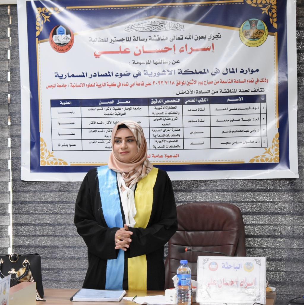 حضرت جزءً منها الاستاذ المساعد ياسمين عبدالكريم محمد علي عميد الكلية وعدد من تدريسييها.تضمنت الرسالة التي تقدمت بها الطالبة إسراء إحسان علي تعريفا لمفهوم المال وبيان اشكاله في المملكة الاشورية فضلا عن اهميته في دعم سلطة الملوك الاشوريين في الجوانب السياسية والعسكرية والاقتصادية والدينية. فقد كرس في بيان مواد اموال الدولة(الملك)تطرقت الرسالة الى اشكال اموال الدولة وموارد تلك الاموال منها الخارجية والمتمثلة بالغنائم والاتاوات والهداياالمقدمة ومنها داخلية متجسدة بأشكال الضرائب المفروضة على رعايا المملكة. وتحدثت أيضا عن مواد اموال المعابدمفصحا عن مصادرها الداخلية والمتمثلة بأنشطة مؤسسة المعابد في اعمال المراباة فضلا عن مصادرهاالخارجية متمثلة بما كان يغدقه الملوك من هدايا وعطايا ونفقات فضلا عما كان يقدمه رعايا المملكة من اموال الىالمعابد. وختم في بيان مواد أموال ورعايا المملكة بدا بمصادر اموال العائلة المالكة الخاصة وموظفي المملكة ورعاياالمملكة الآخرين.ترأس لجنة المناقشة الأستاذ المساعد الدكتور شيماء علي احمد وعضوية كل من الاستاذ المساعد الدكتورة هبة حازم محمد عضوا والمدرس المساعد رامي عبد الحكيم قاسم
