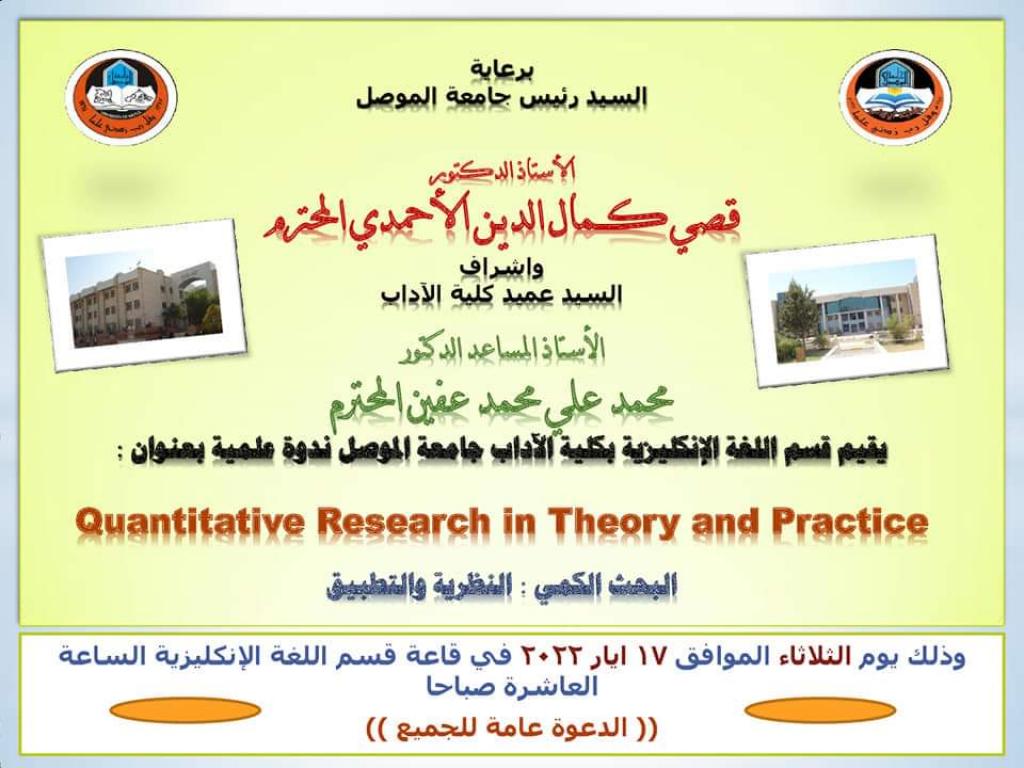 ندوة علمية بعنوان Quantitative Research in Theory and Practice البحث الكمي : النظرية والتطبيق ..يوم الثلاثاء ١٧ آيار ٢٠٢٢ ندوة علمية بعنوان : Quantitative Research in Theory and Practice البحث الكمي : النظرية والتطبيق،حضر جانباً منها عميد الكلية