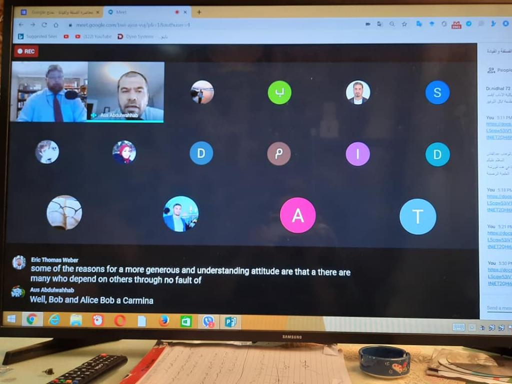 اقام قسم الفلسفة بكلية الآداب في جامعة الموصل و بالتعاون مع جامعة كنتاكي الامريكية محاضرة علمية مشتركة مساء اليوم الخميس الموافق 2020/7/2 ، عبر الفضاء الالكتروني ، شارك فيها تدريسيون من الكلية وجامعتي الموصل وكنتاكي الامريكية واساتذة من الجامعات العراقية والعربية.