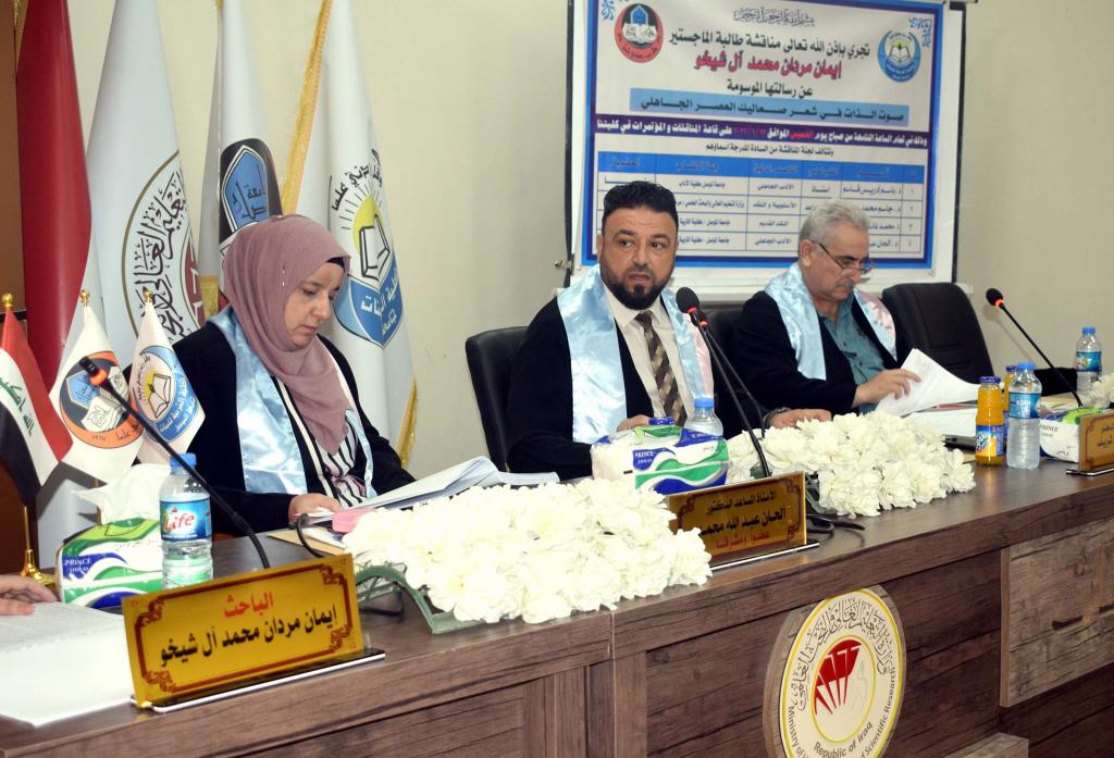ناقشت كلية التربية للبنات بجامعة الموصل رسالة الماجستير الموسومة (صوت الذات في شعر صعاليك العصر الجاهلي) يوم الخميس ٢٣ حزيران ٢٠٢٢،وحضرت السيدة عميد الكلية الأستاذ الدكتورة ضمياء علي عبدالله، والأستاذ الدكتور داؤود حبو محمد معاون العميد للشؤون العلمية، وعدد من تدريسييها، جانباً منها.