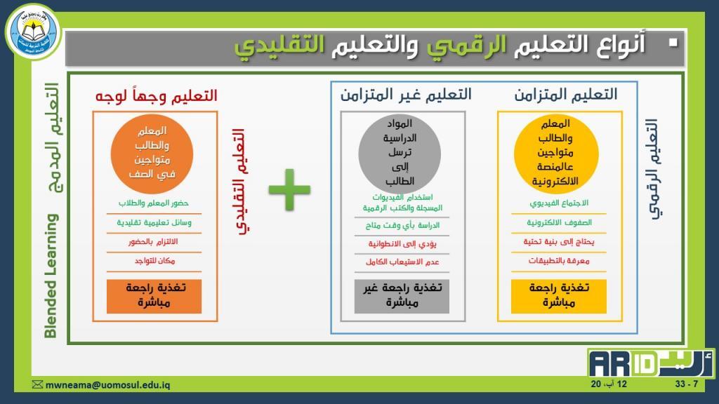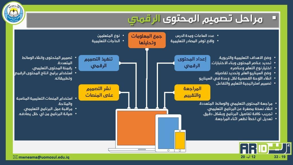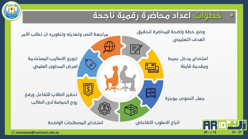 اقامت كلية التربية للبنات في جامعة الموصل وبالتعاون مع منصة اريد للناطقين بالعربية ووحدة الركن الفرانكفورني برئاسة الجامعة ، دورة عن تصميم المحتوى العلمي للمنهج الرقمي ، عبر الفضاء الالكتروني ، يوم الاربعاء الموافق 12 آب 2020، حضرها استاذة ومتخصصين من مختلف الجامعات العراقية والعربية.