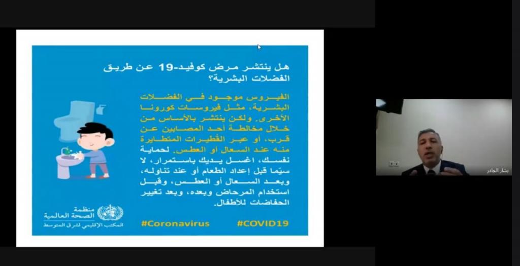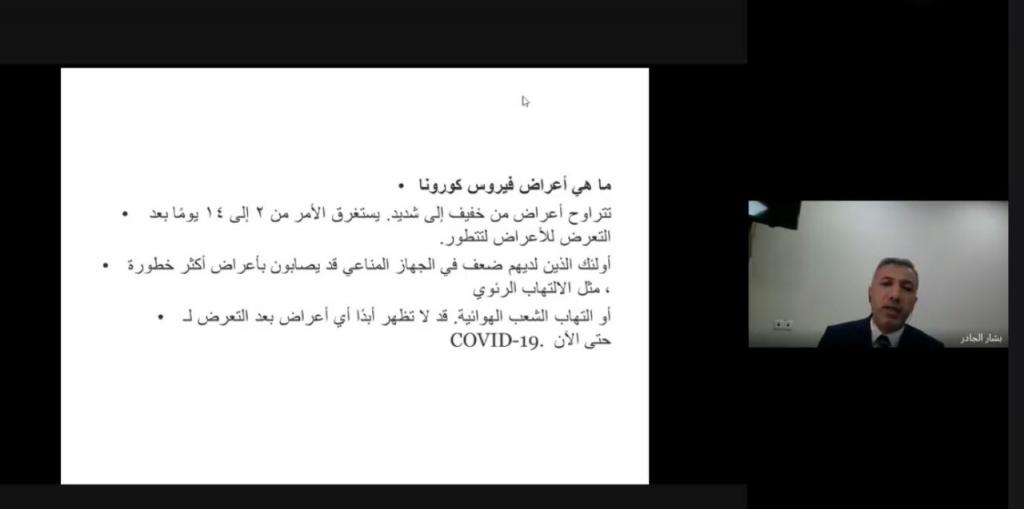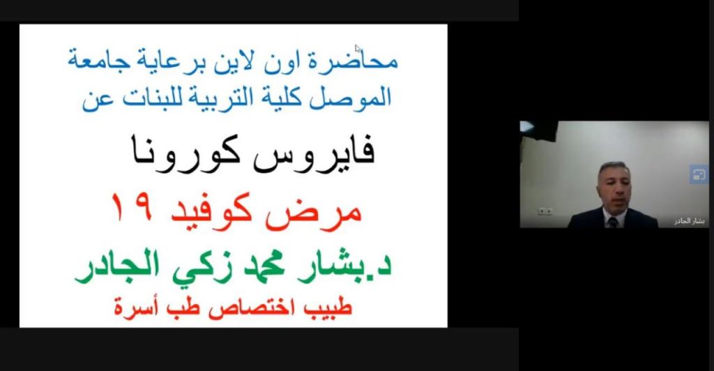 برعاية الاستاذ الدكتور قصي كمال الدين الأحمدي رئيس جامعة الموصل وبإشراف عميد كلية التربية للبنات الاستاذ الدكتورة ضمياء علي عبدالله، وضمن الموسم الطلابي الثقافي الصيفي للعام 2020، وبالتعاون مع مديرية صحة نينوى، اقامت الكلية محاضرة الكترونية عن (فايروس كورونا) وكيفية اجراءات العزل الصحي الصحيح في البيت، وتقوية المناعة، قدمها الدكتور “بشار محمد زكي الجادر” طيبب اختصاص طب الاسرة، يوم الاثنين الموافق 31 آب 2020.