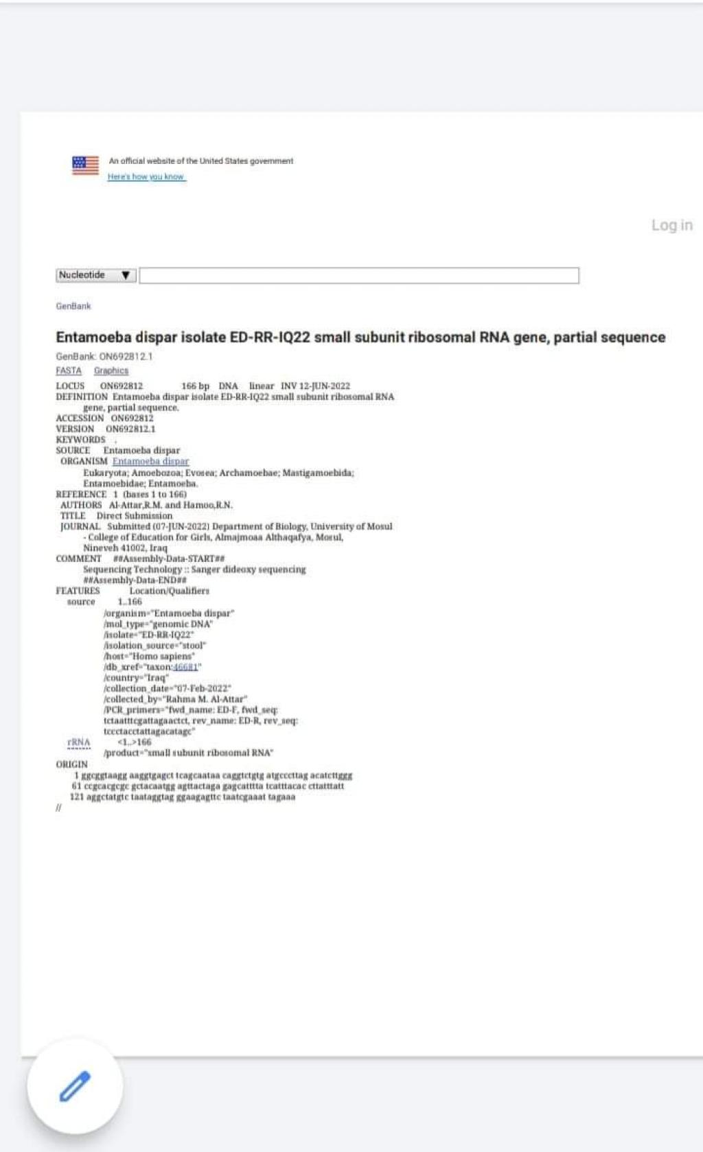 احرزت كلية التربية للبنات انجازاً علمياً جديداً في إطار طالبات الدراسات العليا في قسم علوم الحياة ، حيث تمكنت طالبة الماجستير رحمة مزاحم العطار بإشراف الأستاذ الدكتورة رضاء ناظم حمو من عزل طفيلي Entamoeba dispar لأول مرة في محافظة نينوى من حالات الإسهال للوافدين للمستشفيات ، كما تم تسجيل الجين باسم الباحثتين في جامعة الموصل في المركز الوطني للمعلومات الوراثية NCBI بالرقم 692812 .