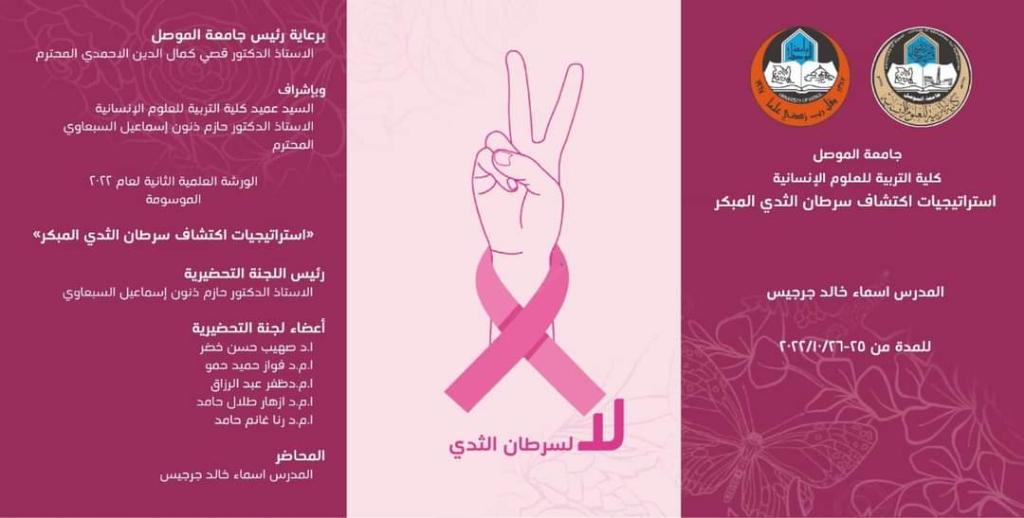 ورشة علمية بعنوان (( استراتيجيات اكتشاف سرطان الثدي المبكر )) ألقتها المدرس اسماء خالد جرجيس التدريسية في قسم الجغرافية يوم الثلاثاء وللمدة ٢٥-٢٦ تشرين الأول ٢٠٢٢ .تهدف الورشة لتوعية المجتمع المحلي النسائي صحياً . فضلا عن زيادة الوعي حول مخاطر مرض سرطان الثدي والتعريف بأعراضه وكيفية الوقاية منه، فضلاً عن أهمية الكشف الذاتي المبكر.
