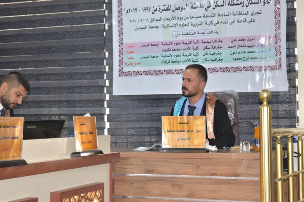 ناقشت كلية التربية للعلوم الإنسانية رسالة الماجستير الموسومة “نمو السكان ومشكلة السكن في مدينة الموصل للفترة ١٩٩٧-٢٠١٧م” صباح يوم الاربعاء الموافق ١٦ أيلول 2020.