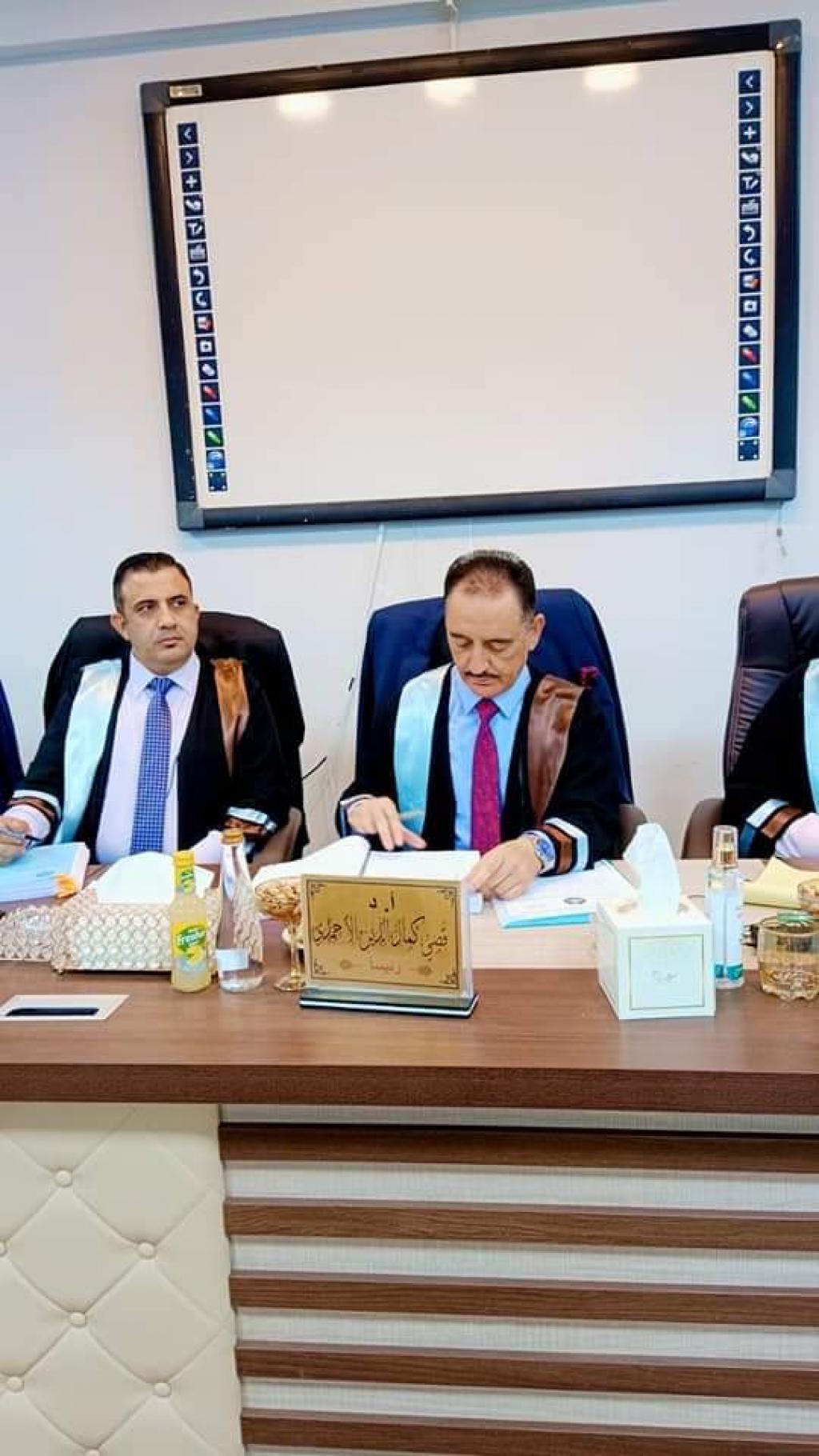 ترأس لجنة المناقشة الأستاذ الدكتور قصي كمال الدين الأحمدي رئيس الجامعة وعضوية كل من الأستاذ الدكتور رياض عباس عبدالجبار من جامعة تكريت والأستاذ الدكتور احمد ساهي درويش من الجامعة المستنصرية والأستاذ الدكتور محمد سعيد فيصل رئيس قسم علوم الحياة والأستاذ المساعد الدكتورة مرا أسامة احمد وبإشراف وعضوية كل من الأستاذ الدكتور يوسف جبار إسماعيل والأستاذ الدكتور عبد العزيز يونس طليع.