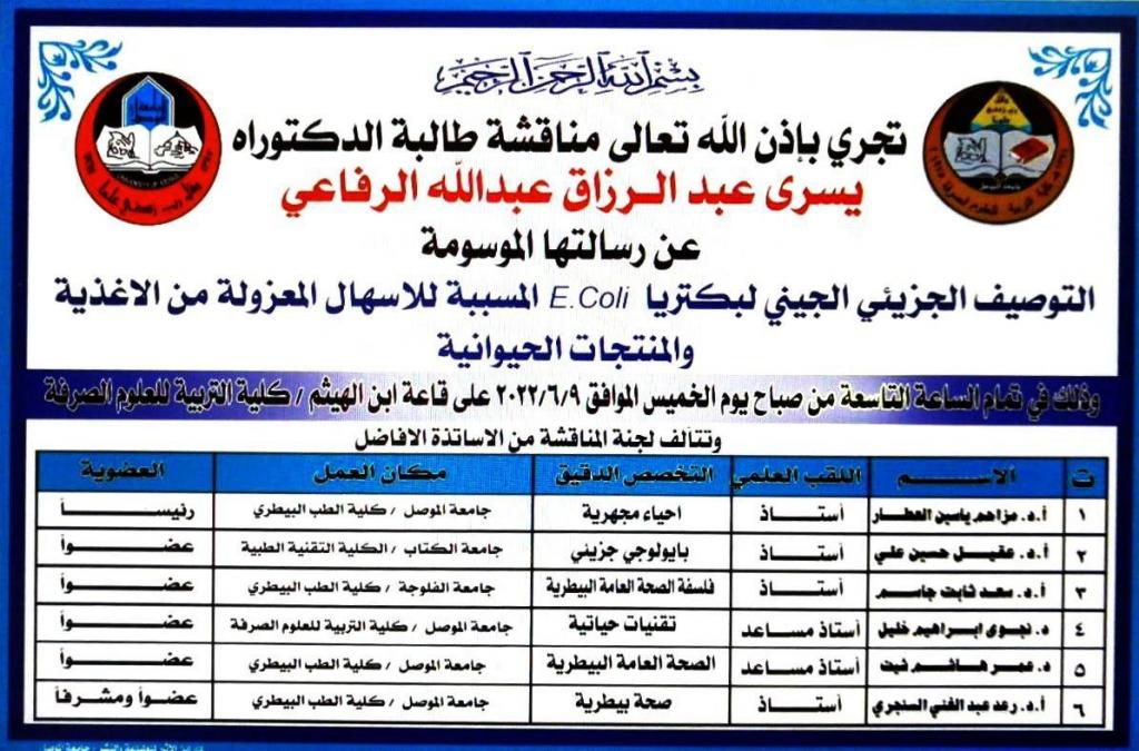 ناقشت كلية التربية للعلوم الصرفة يوم الخميس ٩ حزيران ٢٠٢٢، اطروحة الدكتوراه الموسومة” التوصيف الجزيئي الجيني لبكتريا E. coli المسببة للإسهال المعزولة من الأغذية والمنتجات الحيوانية”حضر جانبا منها عميد كلية الطب البيطري الأستاذ الدكتور ظافر محمد?تهدف الدراسة التي تقدمت بها الطالبة يسرى عبد الرزاق عبد الله الرفاعي في قسم علوم الحياة إلى تحديد مستوى التلوث ومعدل الانتشار الدقيق لـجرثومة الايشيريكيا القولونية في اللحوم ومنتجاته باستخدام تقنية تفاعل البلمرة المتسلسل .حيث تم جمع (782) عينة من اللحوم ومنتجاتها وتشخيصها بالطرق التقليدية وبعدها تم تأكيد تشخيصها بالكشف الجزيئي عن الجين التشخيصي UidA بتقانة تفاعل سلسلة البلمرة (PCR)، إذ تم الكشف عن (376) عزلة تعود للاشريكيا القولونية، حيث كانت 234 عزلة موجبة تعود للحوم الطازجة وكذلك الى منتجات اللحوم مثل البركر واللحم المفروم والباسطرمة والدجاج اخذت من مناطق مختلفة من الذبيحة وكذلك من مناطق مختلفة من مدينة الموصل وايضا استخدمت تقنية تفاعل البلمرة المتسلسل المتعددة PCR Multiplex للكشف عن جينات عوامل الضراوة لعزلات الاشريكيا القولونية (DEC) وذلك عن طريق تضخيم (10) بادئات Primer حيث تم تشخيص (95) نمطاً مرضياً وأظهرت النتائج أن النمط المرضي الأكثر شيوعاً هو الاشريكيا القولونية السامة للأمعاء (ETEC) حيث كانت بمعدل يليها الاشريكيا القولونية المنتجة للسموم الشبيهة بسموم الشيكا Shiga – Toxin Producing E.coli (STEC) ثم الاشريكيا القولونية النزفية للأمعاء (EHEC) يليها كل من الاشريكيا المعوية التكتلية (EAEC) والاشريكيا القولونية المرضية للأمعاء غير النموذجية (aEPEC) ، ثم الاشريكيا القولونية الغازية للأمعاء وأقل نسبة كانت للنمط المرضي للايشريكيا القولونية الملتصقة بالانتشار (DAEC).وقد تم تسجيل عزلتين جرثوميتين الأولى باسم Strain stx-1- YR22, Shiga toxin 1 (stx1) Genes والذي حصل على الرقم المعرف بالتسجيل Gen Bank accession number OM304351 فضلاً عن وجود الجين الثاني وهو Shiga toxin2 والذي تم تسجيل عزلته الجرثومية باسم Strain stx-2- YR22, Shiga toxin 2 (stx2) gene والذي حصل على الرقم المعرف بالتسجيل Gen Bank accession number OM304352، ولوحظ من شجرة النشوء الجيني الخاص بالعترة stx-1-YR22 وجود تقارب بين العترة المحلية وباقي العترات المسجلة في بنك الجينات والمعزولة من سبع بلدان حول العالم وبنسبة 99%، أما بالنسبة للعترة stx-2-RY22 فقد لوحظ وجود تقارب بين العترة المحلية المعزولة من اليابان والعترة المعزولة من النرويج والمسجلة في بنك الجينات.?تراس لجنة المناقشة الأستاذ الدكتور مزاحم ياسين العطار وعضوية كل من الأستاذ الدكتور عقيل حسين علي من جامعة الكتاب والأستاذ الدكتور سعد ثابت جاسم من جامعة الفلوجة والأستاذ المساعد الدكتورة نجوى ابراهيم خليل والأستاذ المساعد الدكتور عمر هاشم شيت وبإشراف وعضوية الأستاذ الدكتور رعد عبد الغني السنجري