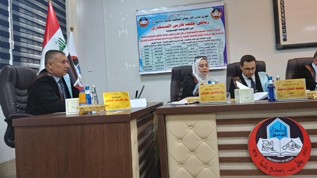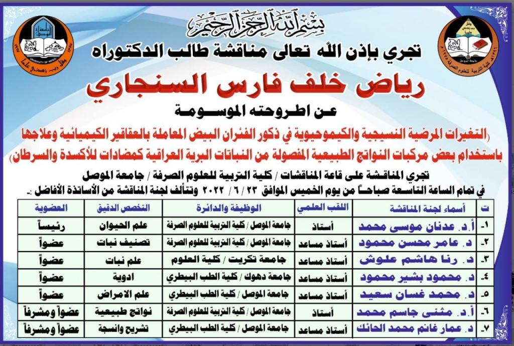 ناقشت كلية التربية للعلوم الصرفة بجامعة الموصل أطروحة الدكتوراه الموسومة ” التغيرات المرضية النسيجية والكيموحيوية في ذكور الفئران البيض المعاملة بالعقاقير الكيميائية وعلاجها باستخدام بعض مركبات النواتج الطبيعية المفصولة من النباتات البرية العراقية كمضادات للأكسدة والسرطان “،