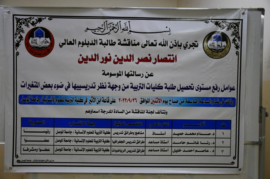 ناقش قسم العلوم التربوية والنفسية في كلية التربية للعلوم الانسانية بجامعة الموصل بحث دبلوم عال عن (عوامل رفع مستوى تحصيل طلبة كليات التربية من وجهة نظر تدريسييها في ضوء بعض المتغيرات)