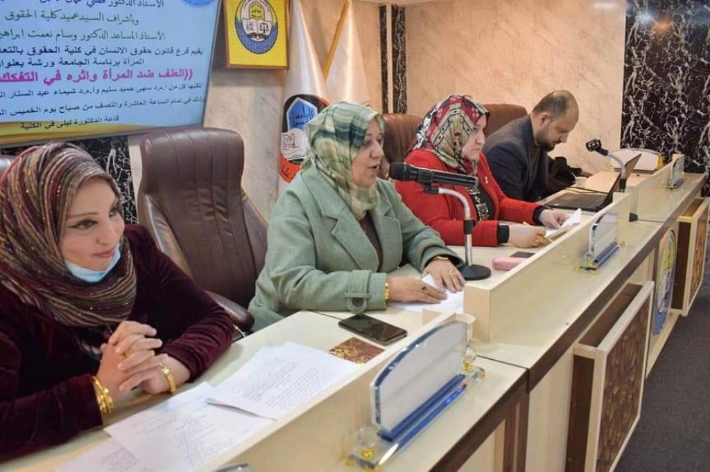 أقامت الكلية يوم الخميس الأول من كانون الاول 2022 ورشته العلمية الموسومة “العنف ضد المرأة وأثره في التفكك الاسري” ،والتي أقامها فرع حقوق الإنسان،حضرها أعضاء مجلس الكلية وعدد من تدريسييها والمدرس المساعد ليلى سيف الدين مسؤولة وحدة تمكين المرأة برئاسة الجامعةحيث قدمت الدكتورة سهى حميد سليم ورقتها البحثية التي اشارت فيها الى ان الاسرة تعد اللبنة الاولى لبناء المجتمع مشيرة الى معنى الأسرة التي يمثل معناها الضيق الحلقة القريبة التي تمثل الزوج والزوجة والمعنى الواسع الذي يشمل الأخوة والاخوات والاعمام والعمات مبينة بعض الاحصائيات الرسمية المقدمة من منظمات دولية اشارت فيها الى تزايد نسبة جرائم العنف ضد المرأة كما اوضحت ايضا التكييف القانوني لجرائم العنف ضد المرأة وفقا لما اشارت إليه المواثيق والصكوك الدولية والقوانين والتشريعات الوطنية مبينة خصائص الجريمة اعلاه واسبابها ،