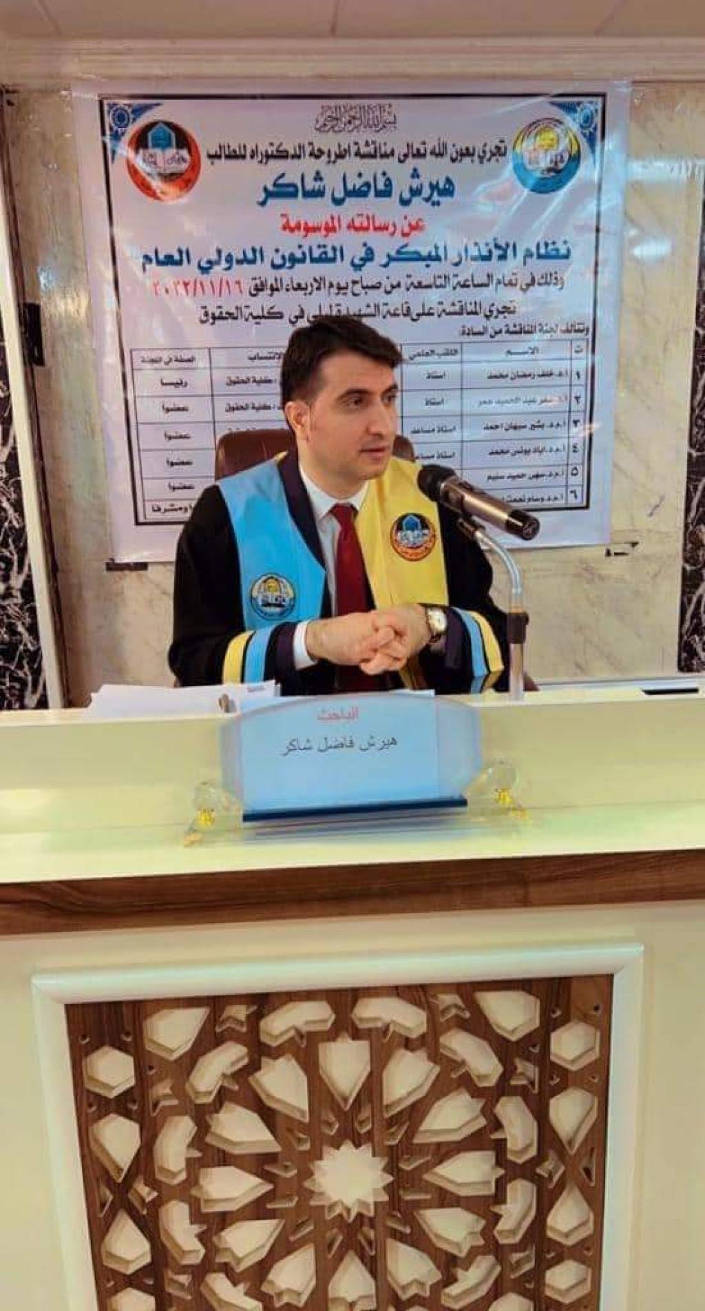 كلية الحقوق تناقش اطروحة دكتوراه عن نظام الانذار المبكر في القانون الدولي العام
