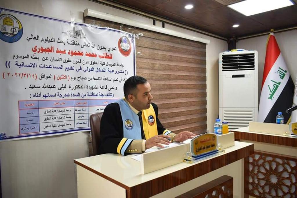 ناقشت كلية الحقوق . بجامعة الموصل يوم الاثنين ١٤ آذار ٢٠٢٢ بحث الدبلوم العالي الموسوم “مشروعية التدخل الدولي في تقديم المساعدات الإنسانية” ، حضر جانبا منها الاستاذ المساعد الدكتور وسام نعمت ابراهيم السعدي عميد الكلية وعدد من اعضاء مجلس الكلية وتدريسييها .تناول البحث الذي تقدم به الطالب محمد محمود عبد في فرع قانون حقوق الانسان ، النزاعات المسلحة والكوارث الطبيعية التي قد تتطلب تقديم المساعدات الانسانية الى المتضررين بدافع الانسانية كما ويلاحظ ان المساعدات الانسانية ظهرت على الصعيد الدولي من خلال الوثائق الدولية الرسمية وغير الرسمية التي حددت الخصائص التي تميز التدخل الدولي في تقديم المساعدات الانسانية .