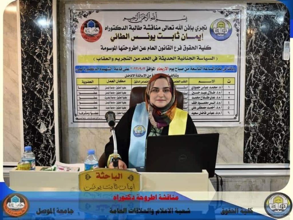 ناقشت كلية الحقوق بجامعة الموصل يوم الاربعاء ٧ ايلول ٢٠٢٢ اطروحة دكتوراه عن “السياسة الجنائية الحديثة في الحد من التجريم والعقاب”حضر جانبا منها الاستاذ المساعد الدكتور وسام نعمت ابراهيم السعدي عميد الكلية وعدد من اعضاء مجلس الكلية وتدريسييها .