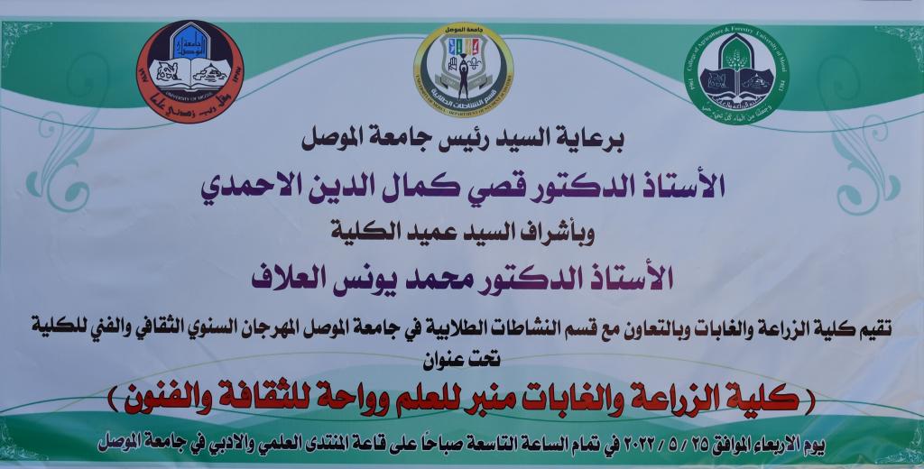 برعاية الاستاذ الدكتور قصي كمال الدين الأحمدي رئيس جامعة الموصلأقامت كلية الزراعة والغابات بجامعة الموصل مهرجانها السنوي الثقافي الفني بالتعاون مع قسم النشاطات الطلابية برئاسة الجامعة، تحت عنوان “كلية الزراعة والغابات منبر للعلم وواحة للثقافة والفنون” حضر ممثلاً عن الاستاذ الدكتور قصي كمال الدين الأحمدي، الاستاذ الدكتور منير سالم طه مساعد رئيس الجامعة للشؤون العلمية اليوم الأربعاء 25 آيار 2022،جلسة الإفتتاح كانت في قاعة المنتدى العلمي والادبي. بحضور عميد الكلية الاستاذ الدكتور محمد يونس العلاف وعدد من تدريسييها ومنتسبيها وطلبتها،تضمن برنامجاً ابتدأ بقراءة آي من الذكر الحكيم وكلمة عميد الكلية وقصيدة شعرية لأحد الطلبة بعدها كان هناك تكريم للتدريسي المتميز والموظف المتميز، والطلبة المتميزين والأوائل للعام الدراسي المنصرم.معارض متنوعة ومهرجانات كانت محتوىً لهذا المهرجان، منها معرض للنتاجات العلمية ، معرض الزهور، معرض الألبان، منتجات الثروة الحيوانية، منتجات منحل الكلية، التصوير الفوتوغرافي، لوحات فنية، أشغال يدوية، وختامها كان مهرجان رياضي أقيمت فيه مباراة لكرة قدم الصالات بين فريقي طلبة الكلية وفريق المنتسبين.