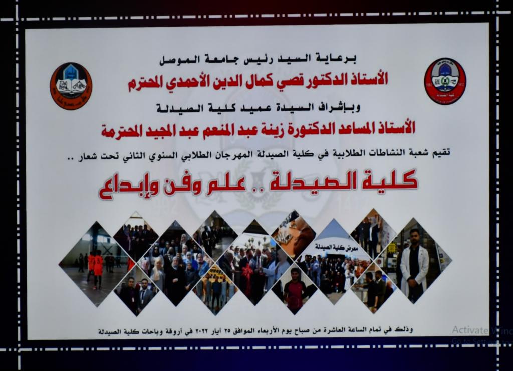 برعاية الاستاذ الدكتور قصي كمال الدين الأحمدي رئيس جامعة الموصل وحضور الأستاذ الدكتور وحيد محمود الإبراهيمي مساعد رئيس الجامعة للشؤون الإدارية ممثلاً عن سيادتهأقامت كلية الصيدلة مهرجانها الثقافي والرياضي السنوي تحت عنوان “كلية الصيدلة… علم وفن وابداع” اليوم الأربعاء 25 آيار 2022.تضمنت فقراته مهرجاناً لمجموعة متميزة من نتاجات الطلبة في مختلف مجالات العلم والإبداع فضلاً على فعاليات بعض المدارس والمنظمات والأندية الرياضية في محافظة نينوى التي عكست نهج الجامعة وتعاونها مع المجتمع، منها معرض صوري لتاريخ الكلية منذ تأسيسها ١٩٦٤ وإعادة افتتاحها عام ١٩٩٢ ولحد الآن.وفعاليات رياضية توزعت بين الريشة الطائرة والتايكواندو وإقامة المباراة النهائية لدوري الكلية بكرة القدم ومعرض للزي الفلكلوري والأشغال اليدوية والتصوير والرسومات للطلبة و معرض أعمال الطبخ والحلويات وأعمال مسرحية لطلبة المدارس وبازار شعبي لمختلف النتاجات فضلاً عن تكريم الطلبة والأساتذة الفائزين بالمراكز الأولى على مستوى الجامعة في مختلف الفعاليات الرياضية والفنون الإبداعية.