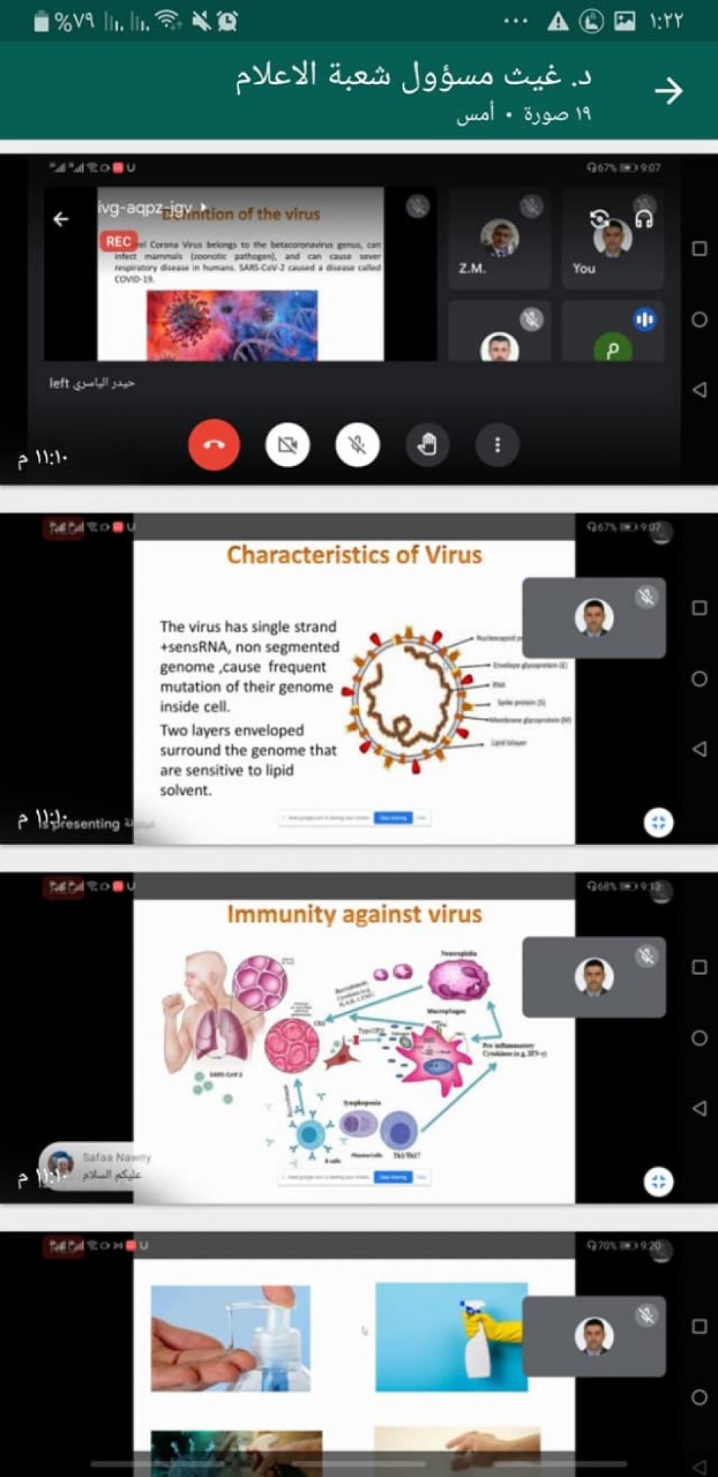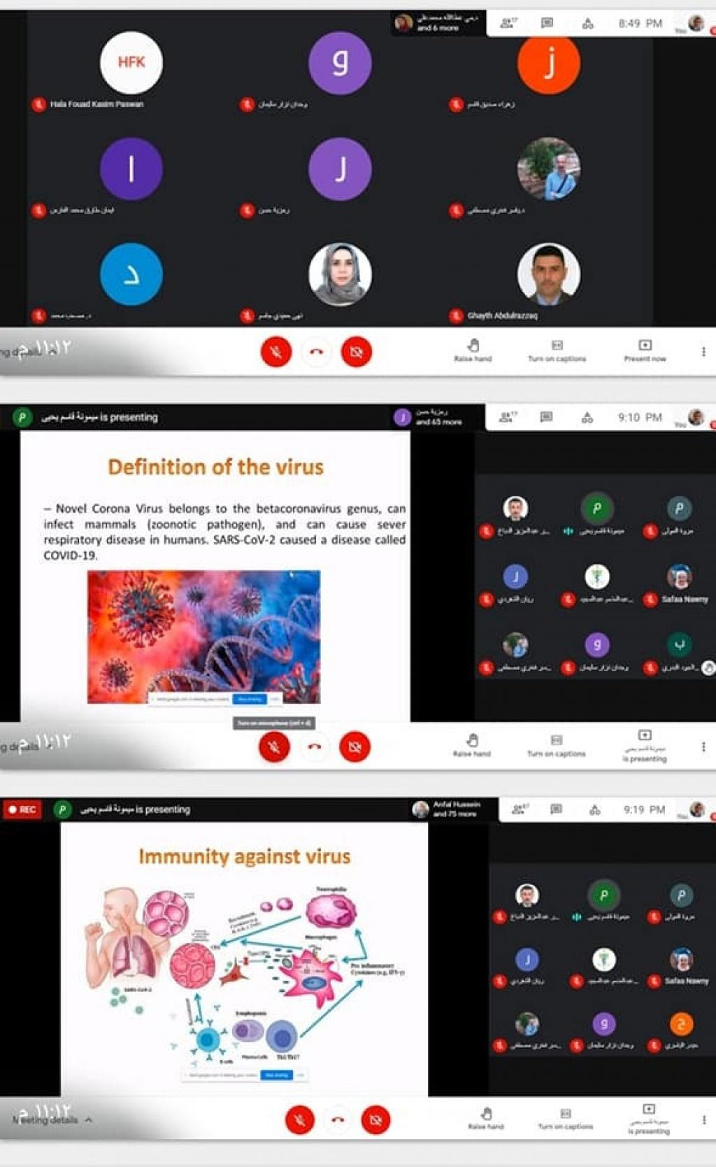 أقام فرع العلوم المختبرية السريرية في كلية الصيدلة بجامعة الموصل ورشة عمل الكترونية مكثفة عن فرضيات الوقاية من فايروس كورونا : ما لها و ما عليها، يوم الثلاثاء 1 حزيران 2021. حضرها السيدة عميد الكلية الاستاذ المساعد الدكتورة زينة عبدالمنعم عبدالمجيد والسادة رؤساء الفروع العلمية وجمع من أساتذة ومنتسبي كلية الصيدلة و كليات جامعة الموصل و بعض الجامعات العراقية وطلبة الدراسات العليا فيها.