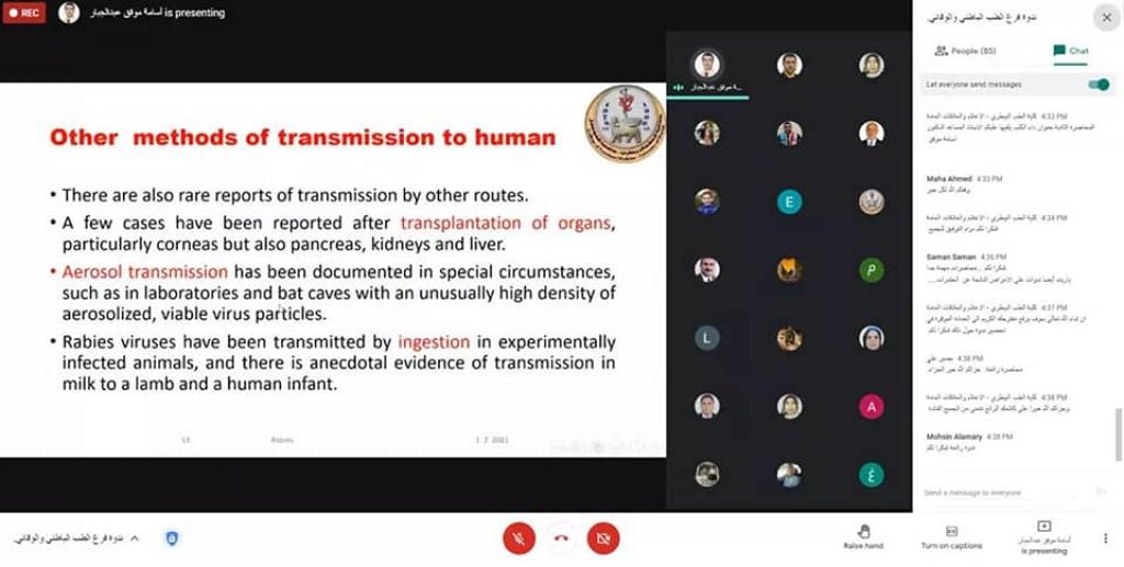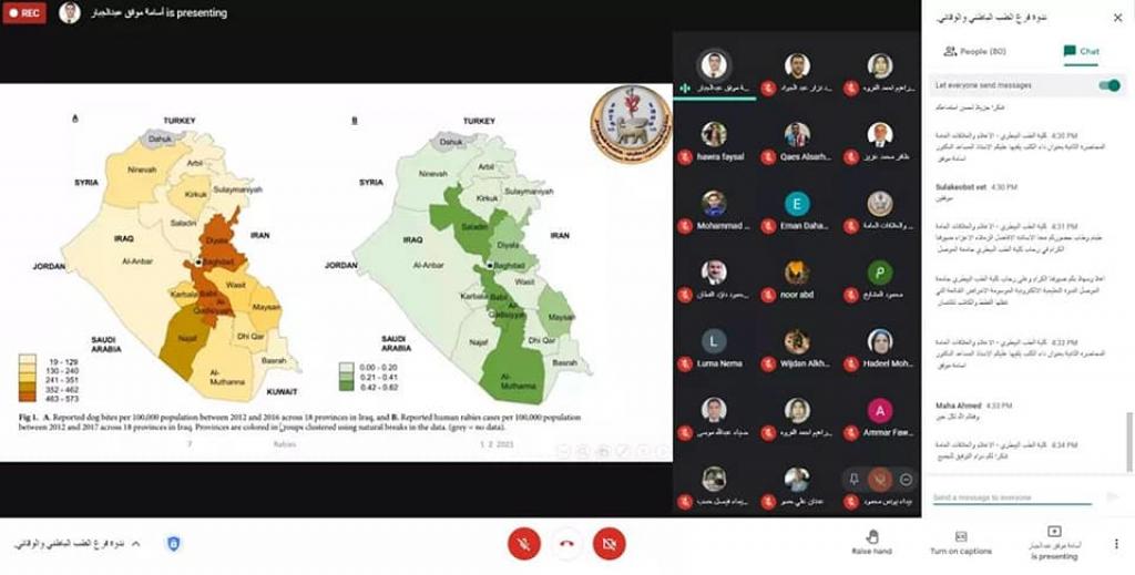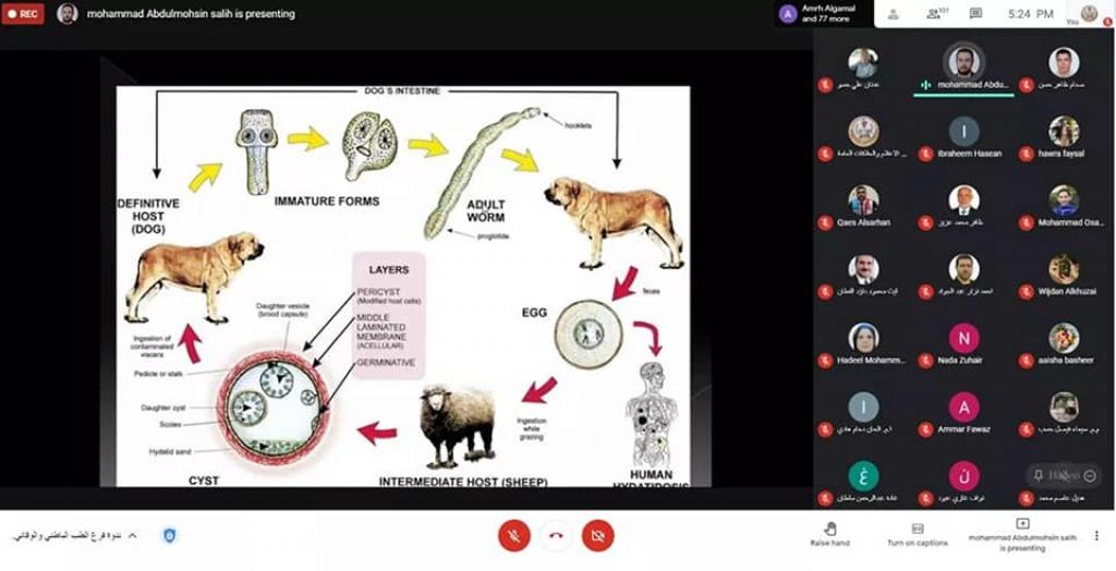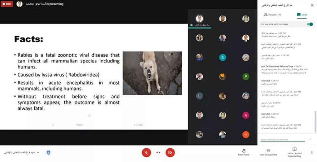 برعاية السيد رئيس جامعة الموصل الاستاذ الدكتور قصي كمال الدين أقامت كلية الطب البيطري يوم الاثنين الموافق ٢شباط ٢٠٢١، الندوة العلمية والتي اقامها فرع الطب الباطني والوقائي والموسومة “الامراض الشائعة التي تنقلها القطط والكلاب للانسان ” عبر الفضاء الالكتروني من خلال منصة Google Meet .تناولت محاضراتها بعضاً من الأمراض منها داء السهميات الذي هو من الامراض الطفيلية المشتركة تسببه يرقات الديدان السهمية التي تطرحها الكلاب والقطط، وداء الكلب ومسبباته، وأمراض خدوش القطط ومرض الأكياس المائية، وداء القطط كما تناولت الطب الوقائي البيطري والأمراض الانتقالية المرتبطة بالكلاب والقطط.هدفت الندوة إلى التعريف بمسببات هذه الأمراض وطرق علاجها والوقاية منها عبر اتباع أساليب النظافة والابتعاد عن التلامس مع هذه الحيوانات خوفاً من الإصابة.