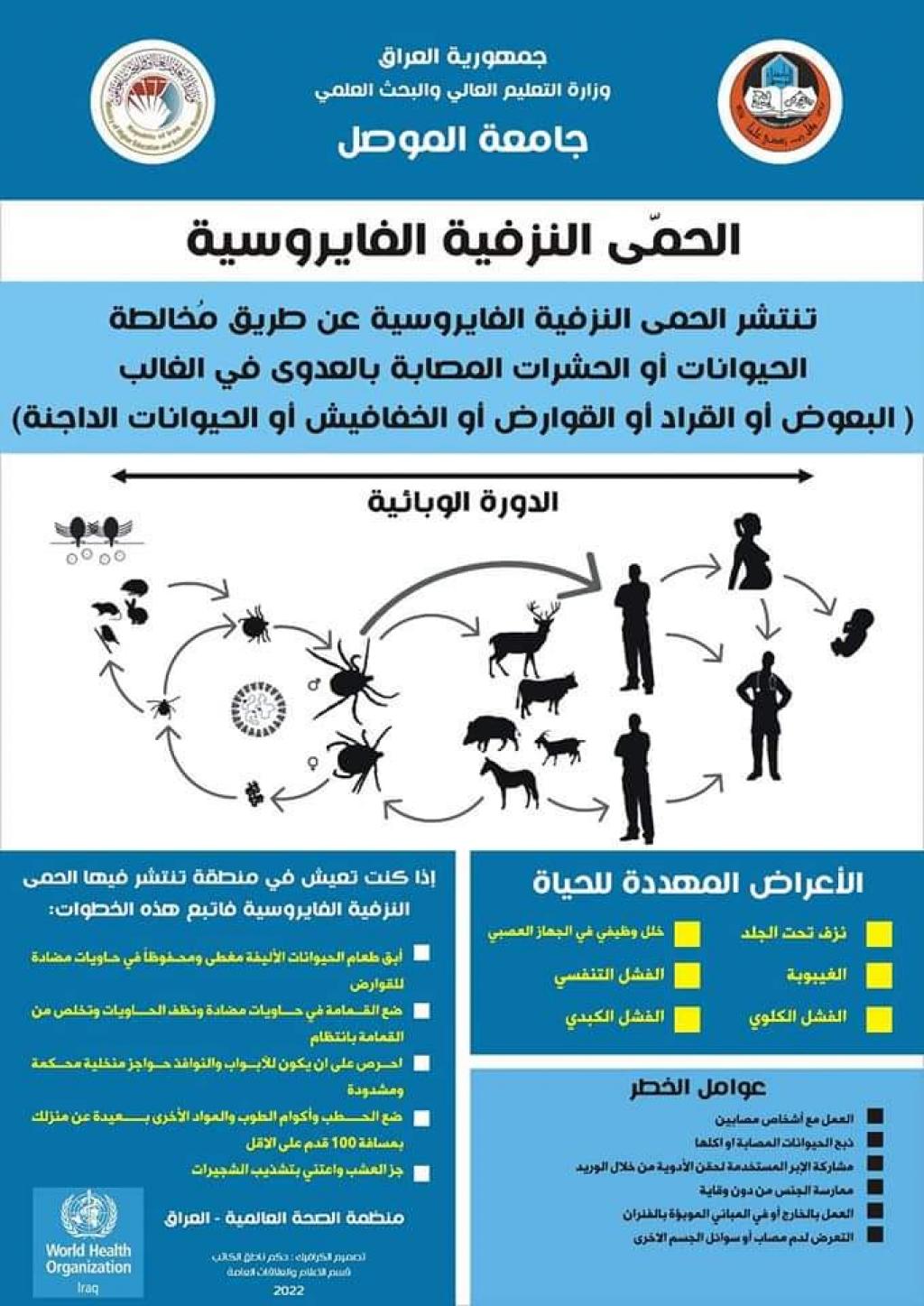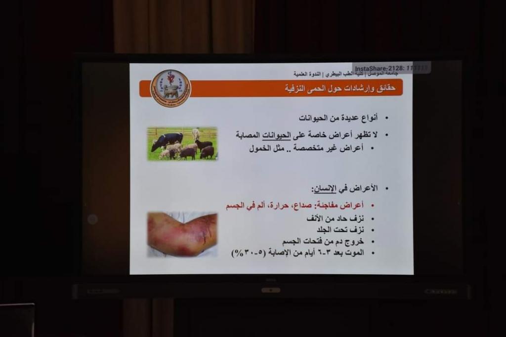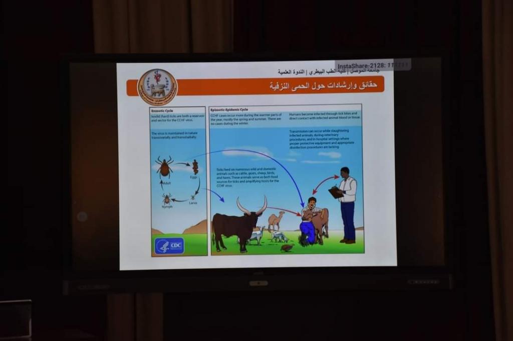 برعاية وحضور الاستاذ الدكتور قصي كمال الدين الاحمدي رئيس جامعة الموصل ، أقامت كلية الطب البيطري الندوة العلمية الموسومة ( الحمى النزفية – حمى القرم – الكونغو) يوم الخميس 12 ايار 2022، كما حضرها عميد الكلية وعدد من تدريسييها .تناولت الندوة تعريفاً بالمرض والعوامل المسببه له وانتشاره الجغرافي والحبوانات الخازنه للعدوى وكيفية انتقالها ، كما تحدثت عن وسائل التشخيص وانواعه والوقاية منه ومكافحته.خرجت الندوة بجملة من التوصيات والمقترحات .