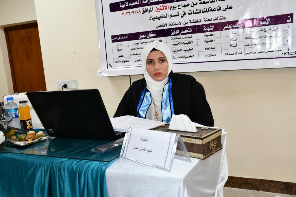 ناقشت كلية العلوم رسالة الماجستير الموسومة “التقدير الطيفي للاستيل سيستين في مستحضراته الصيدلانية يوم الاثنين ١٨ تموز ٢٠٢٢،حضر جانبا منها الاستاذ الدكتور منير سالم طه مساعد رئيس الجامعة للشؤون العلمية، والاستاذ الدكتورة هيام عادل ابراهيم عميد الكلية.تناولت الرسالة التي تقدمت بها الطالبة شهد لقمان حسن شكر في قسم الكيمياء، مقدمة عن المركب الدوائي الاستيل سيستين واهميته الطبية والعلاجية والفيزيائية والكيميائية والطرائق التحليلية المعتمدة في تقديره،ترأس لجنة المناقشة الأستاذ الدكتور وعضوية كل من الاستاذ الدكتور معاذ عبدالله نجم عبدالله والأستاذ الدكتور عبدالمجيد خورشيد احمد علو من جامعة كركوك وعضوية وإشراف الأستاذ المساعد الدكتور سعد حساني سلطان جرجيس